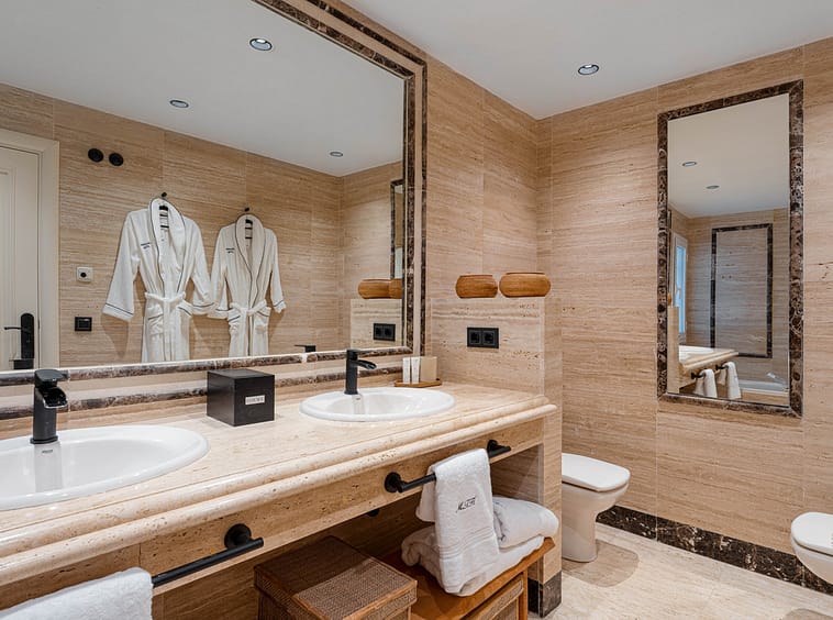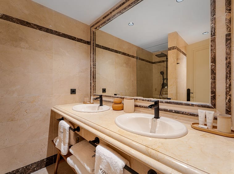 The three private double suites have been designed to offer an atmosphere of absolute serenity and exclusivity. Two of the bedrooms feature elegant en-suite bathrooms with underfloor heating, creating a sense of well-being throughout the year.