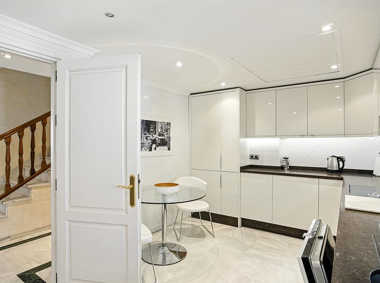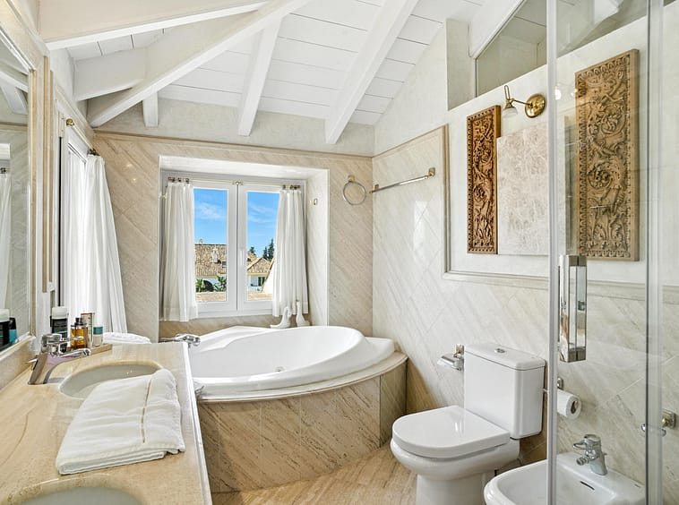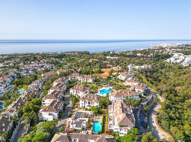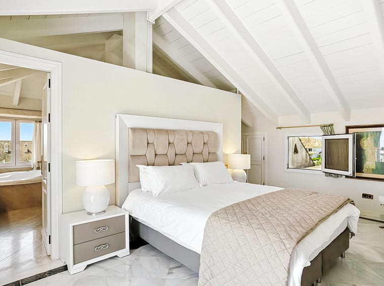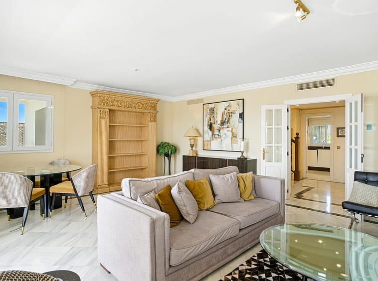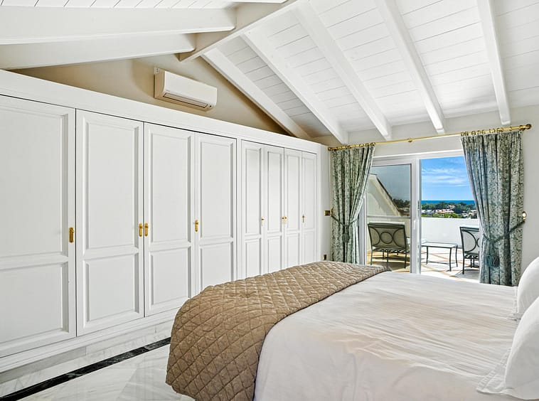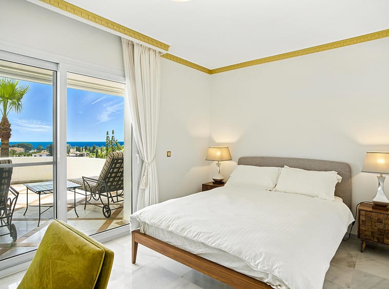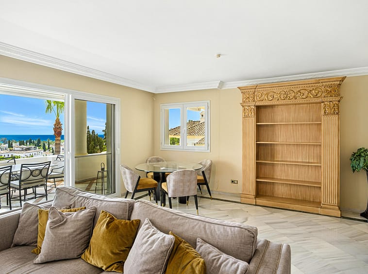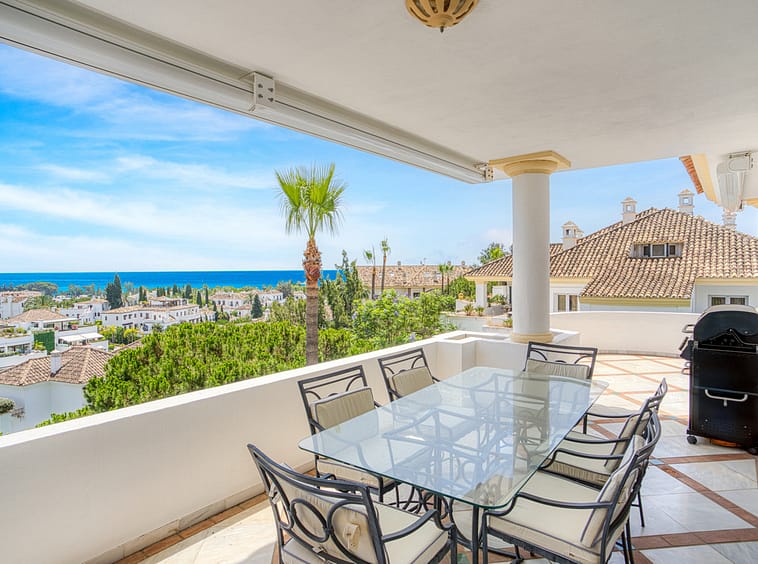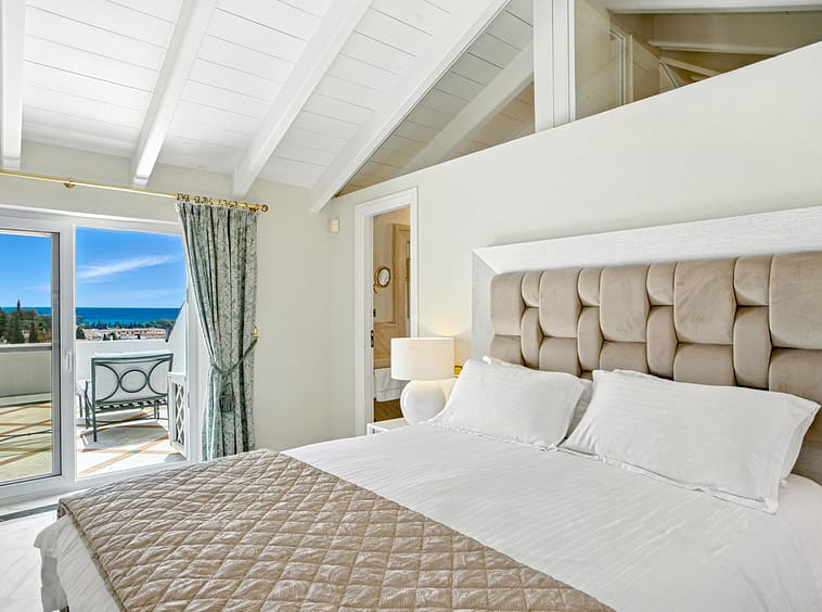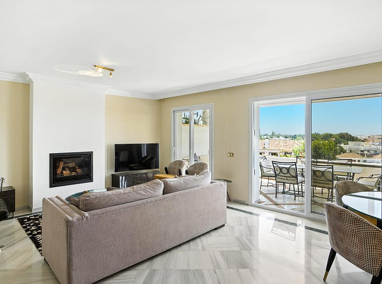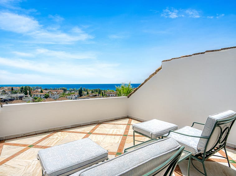 Wonderful three bedroom, south east facing duplex penthouse in the exclusive and gated community of Monte Paraiso on the Golden Mile. With 24hr security, several outdoor swimming pools, a bar/restaurant, children’s play area, fully equipped gym, steam room, sauna, squash court, massage room, indoor heated swimming pool and tropical gardens that are maintained to the highest standards. As well as all this it is only a short walk to the famous Puente Romano Hotel and the beach. The main level of the property has a large living and dining area with patio doors leading out to the spacious terrace with amazing sea views; a fully fitted kitchen with separate utility room; two guest bedrooms, one with a private terrace with stunning views to La Concha mountain; and a guest bathroom. The upper level leads to the master suite with vaulted ceilings, a Jacuzzi bath and access to a private terrace with spectacular sea views. Other features include marble floors, fireplace, fitted wardrobes, hot and cold air conditioning, two private parking spaces and a storage room.