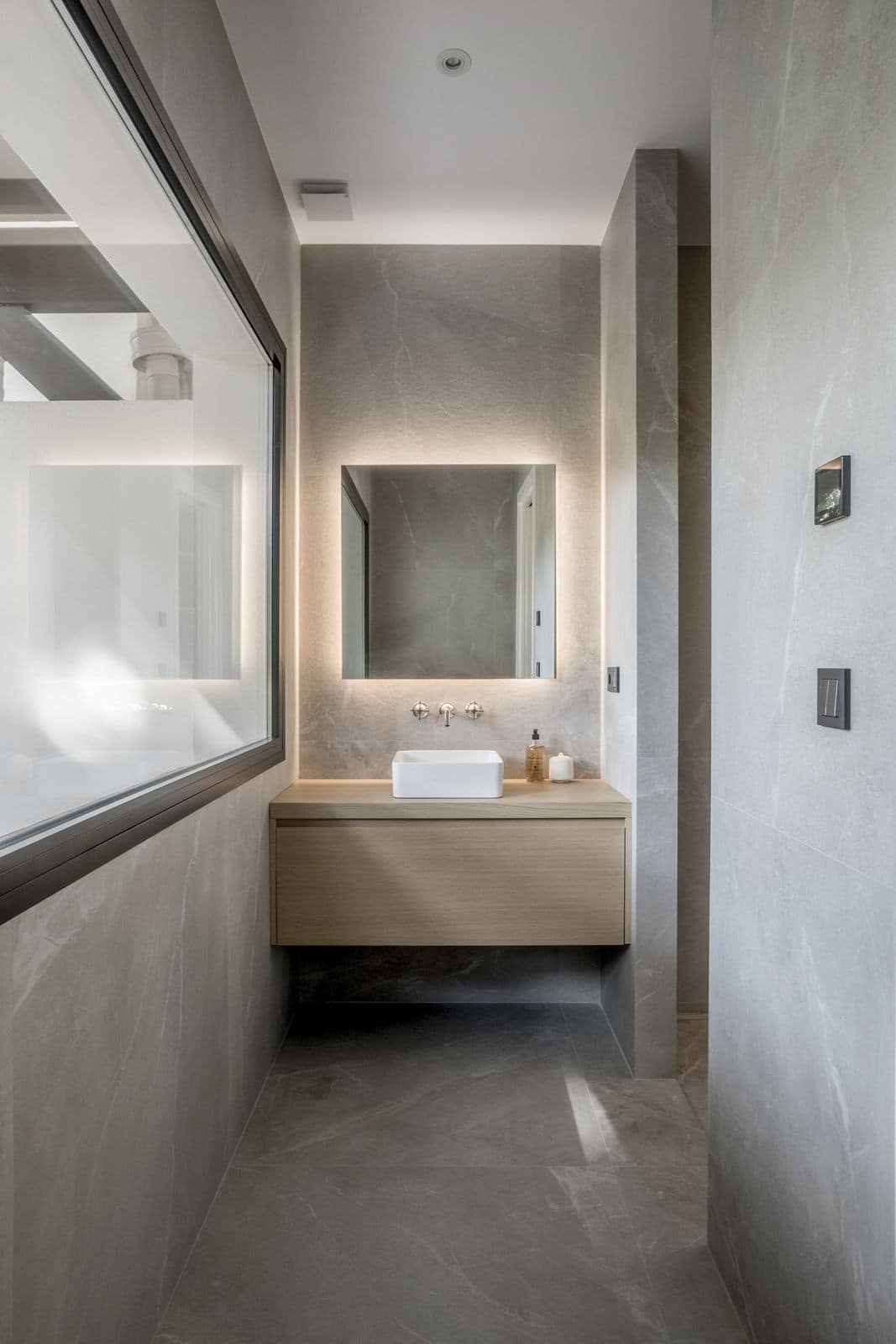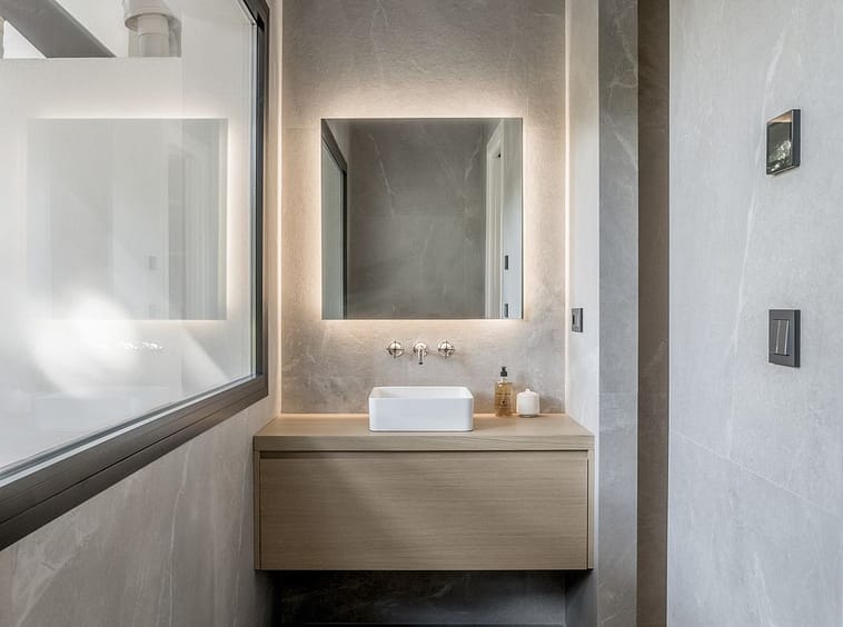 The three bedrooms are refined and sophisticated, featuring wooden accents, bespoke wardrobes, and flattering LED lighting throughout. The elegantly decorated bathrooms are crowned with luxury showers and faucets from Dornbracht, where the grand master bathroom is completed with a bathtub and double vanity.
