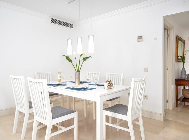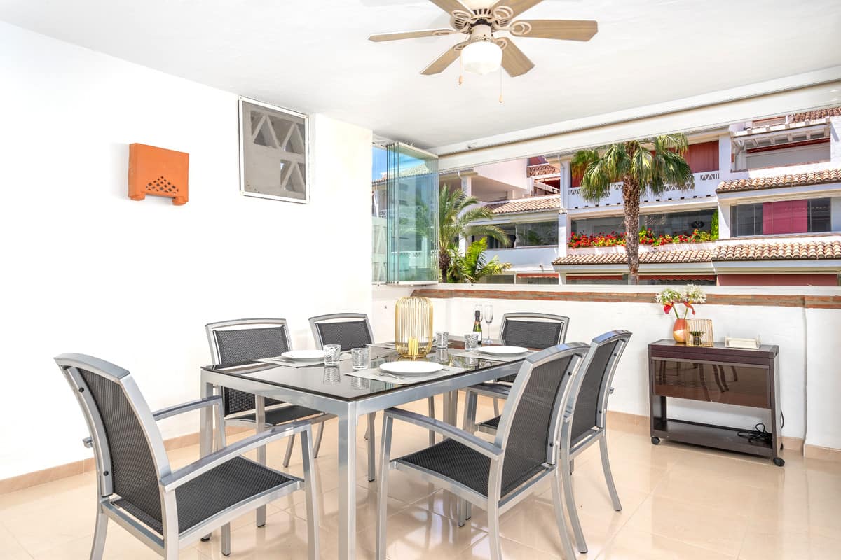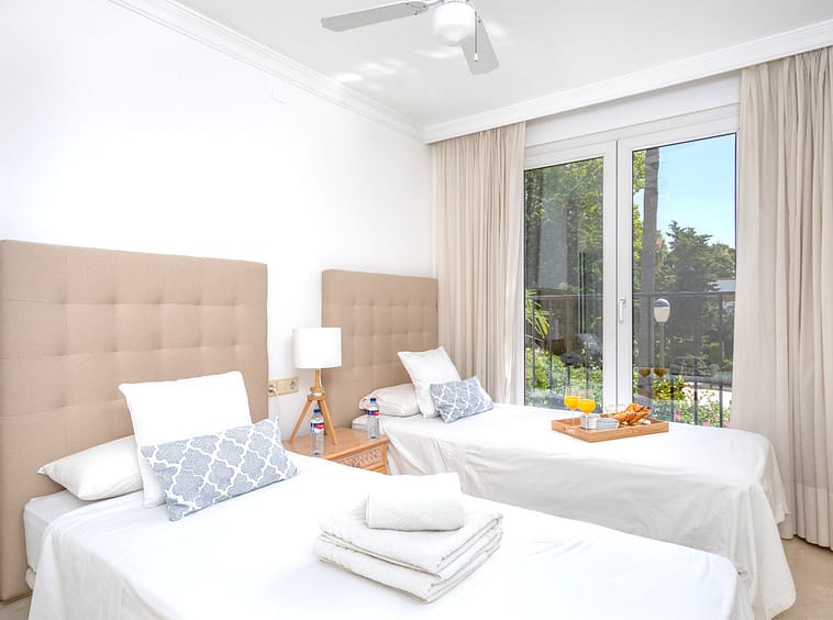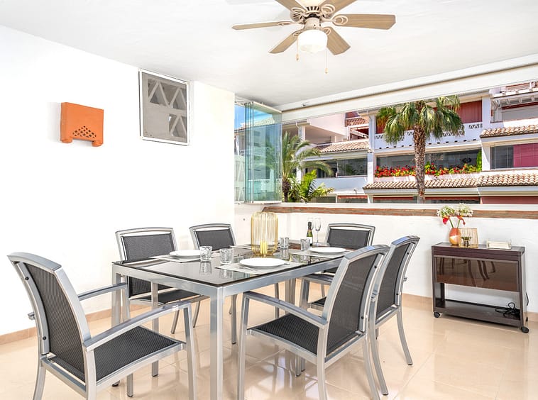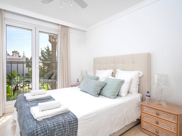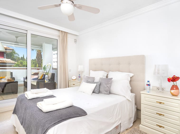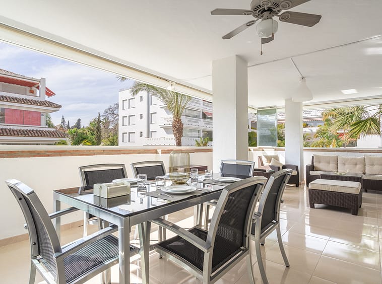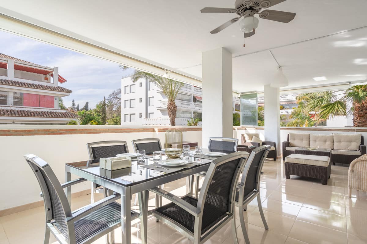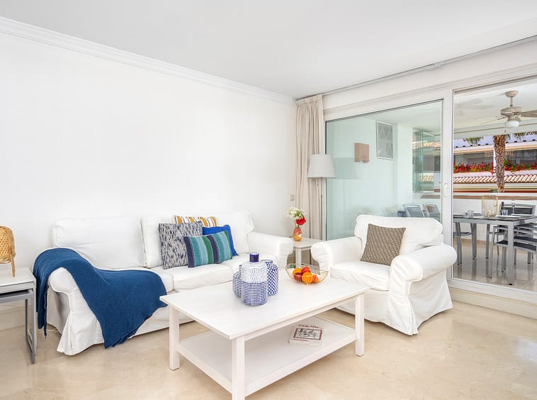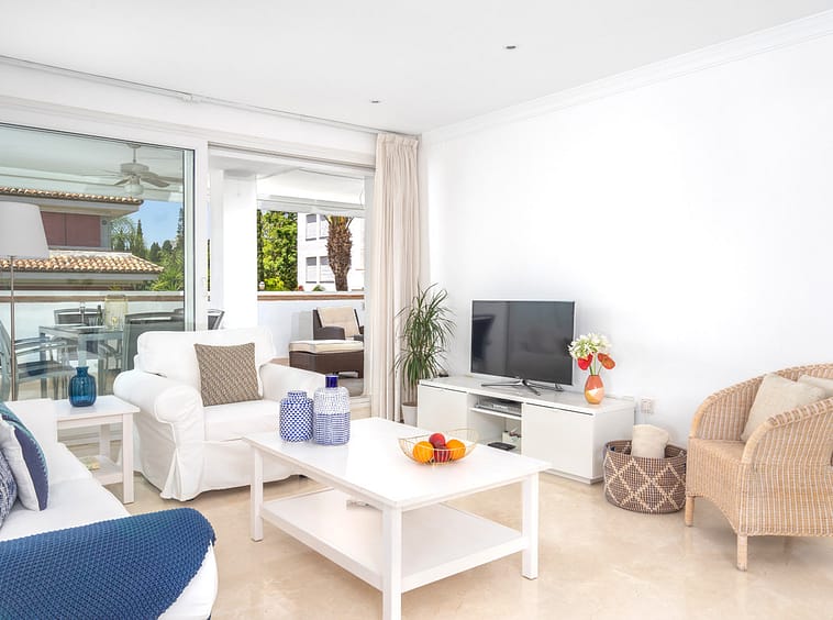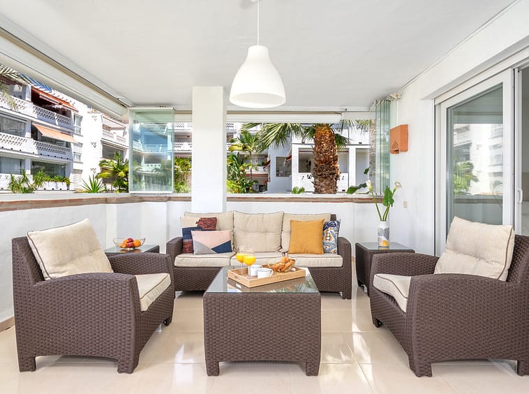 Excellent three bedroom, first floor apartment on Marbella’s Golden Mile, in the sought after frontline beach community Las Cañas Beach, with 24hr security service, several communal swimming pools and tropical gardens. As well as being only a short walk to many bars, shops and restaurants. Casablanca Beach, one of the best on the coast, is just outside the front door. The apartment has a spacious open plan living and dining area with French doors leading out to the private terrace which is enclosed with glass curtians; fully fitted kitchen; master suite with access to the terrace; two guest bedrooms and a guest bathroom. Other features include hot and cold air conditioning, fitted wardrobes and underground parking space.