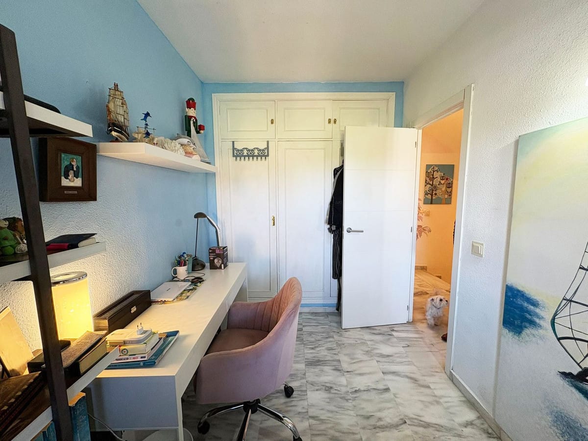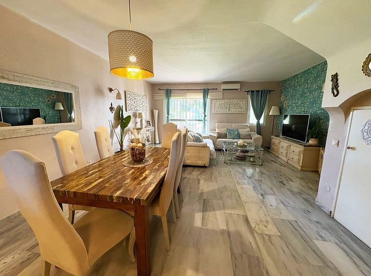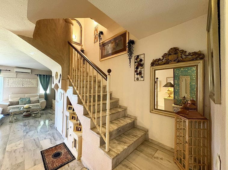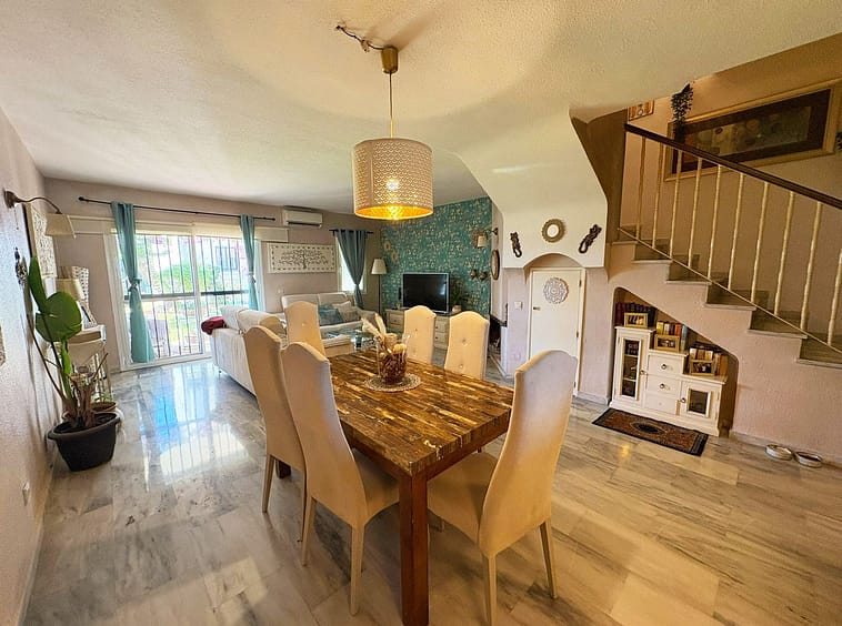 The home combines functionality with charm, offering a fully fitted kitchen, marble flooring, air conditioning, and double-glazed windows. A private roof terrace and additional outdoor spaces provide ample room for relaxation and entertaining. This is an ideal property for those seeking a well-positioned home in a secure and established community on the Costa del Sol.