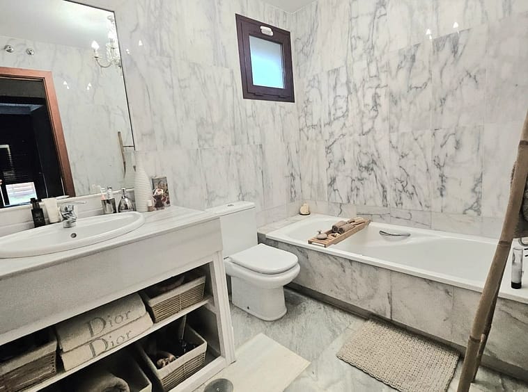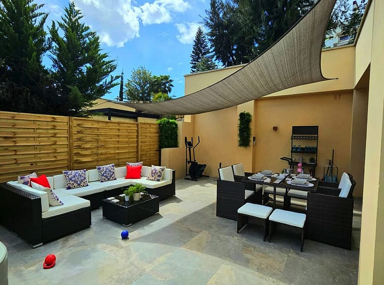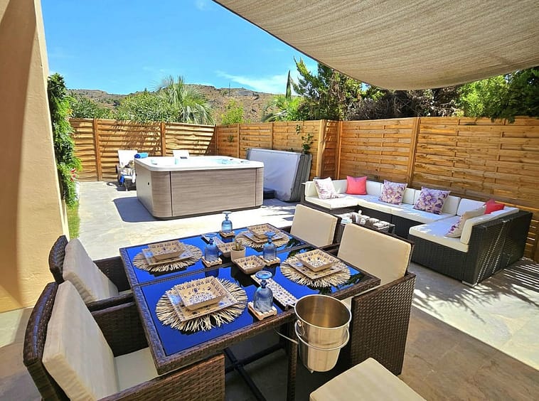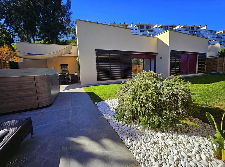 Impeccably maintained, this villa features three bedrooms (two with en-suite bathrooms), three bathrooms (two en-suite), an inviting entrance hall, an open-plan living-dining room, and a brand-new fully equipped kitchen with integrated oven, microwave, coffee maker, fridge-freezer, dishwasher, and quartz worktops. Luxurious marble flooring extends throughout, while the expansive outdoor terrace – recently renovated – includes a 5-person jacuzzi for ultimate relaxation. The fully fenced landscaped garden boasts automatic irrigation, ensuring low-maintenance beauty.