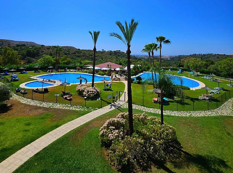 Residents enjoy an impressive array of country club amenities: gated entry with 24-hour concierge and security, three outdoor pools, one heated indoor pool, a fully equipped gym, indoor squash courts, sauna, steam bath, jacuzzi, tennis courts, football/basketball pitch, tropical gardens with fountains and fruit trees, a library, and a chiringuito for casual dining. This pet-friendly, well-maintained community also offers spa facilities, indoor and outdoor lounges, and superb recreational options like tennis and squash – all set in a tranquil, nature-inspired environment just 80 km from Malaga Airport.