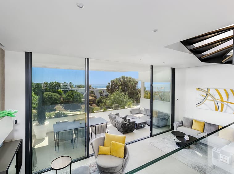 On the upper floor, the main entrance opens into the living area with an open kitchen. Large windows frame the view of the greenery and the sea. At the front, there is a terrace with morning sun; at the back, another terrace with evening sun and open sea views. A staircase connects the terrace directly to the garden.