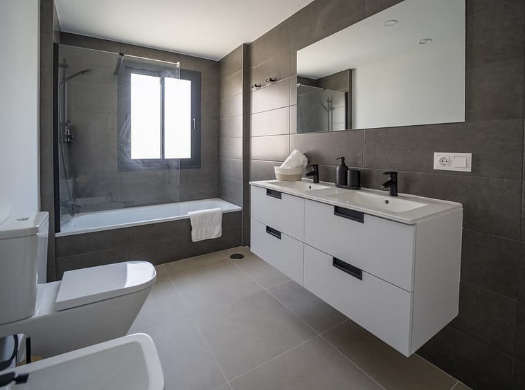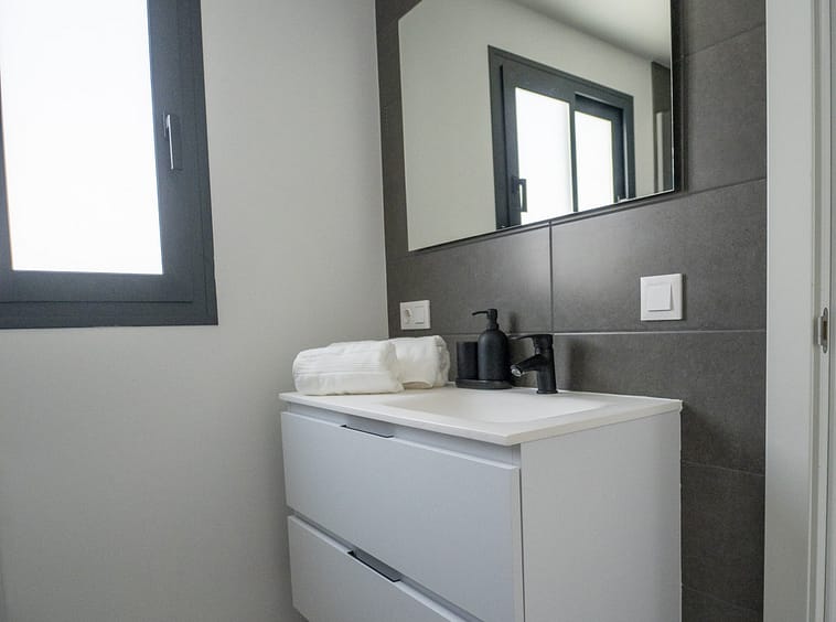 The ground floor boasts a spacious living area that opens directly onto a private terrace, ideal for relaxing or entertaining guests. The contemporary kitchen is fully integrated into the living space, and there's also a separate laundry area equipped with a washing machine and dryer for added convenience. The home offers a total of three bedrooms and two bathrooms, designed to comfortably accommodate families, couples, or groups.