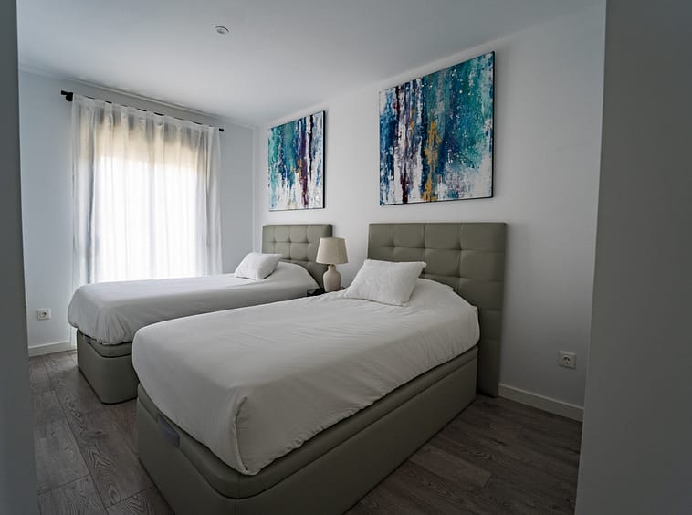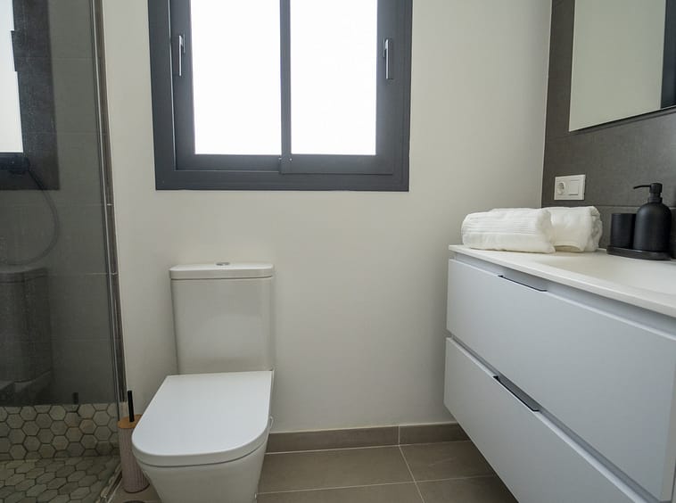 On the first floor, two well-appointed bedrooms provide cozy sleeping arrangements—one with a double bed and the other with two single beds. The top floor is reserved for the master suite, complete with a private bathroom and an exclusive terrace, offering the perfect spot to enjoy quiet moments in the sun.
