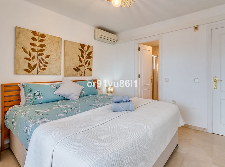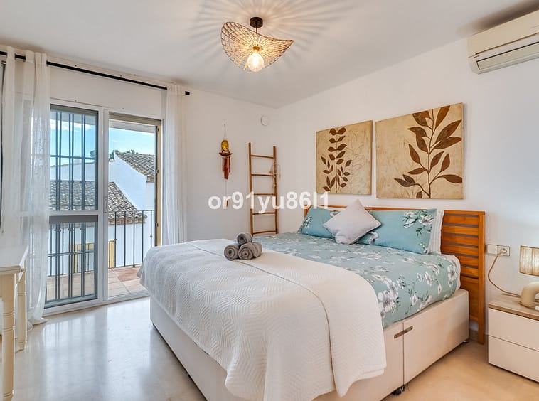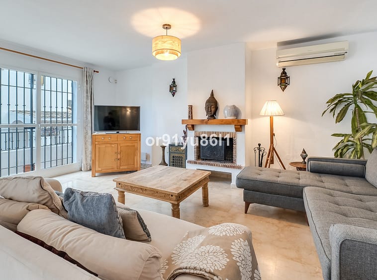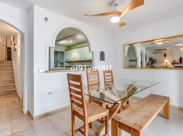 Townhouse Close to the Beach in Costabella Located within a gated, secure community in Costabella, just a short stroll from the beach, this three-bedroom, two-bathroom townhouse features a bright, spacious interior comprising a cosy living room with fireplace and an open-plan kitchen. Step out onto the private, shaded patio—an inviting space for al fresco dining or a relaxing evening with a glass of wine. The well-kept gardens and large communal swimming pool contribute to creating a serene and exclusive atmosphere.