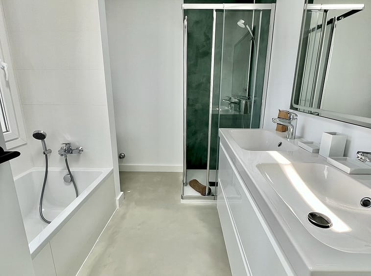 On the ground floor, you’ll find a bright and spacious living area that includes a comfortable lounge with fireplace, a generous dining room, and a fully equipped open-plan kitchen. This level also offers a guest toilet for added convenience. Two terraces, one at the front and one at the rear, as well as a private garden provide plenty of outdoor space to enjoy. From the garden, you have direct access to the large communal pool within the residence.