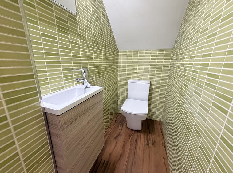 On this same level, there is a guest toilet and a full bathroom with exterior access, thoughtfully designed to serve the pool area directly.