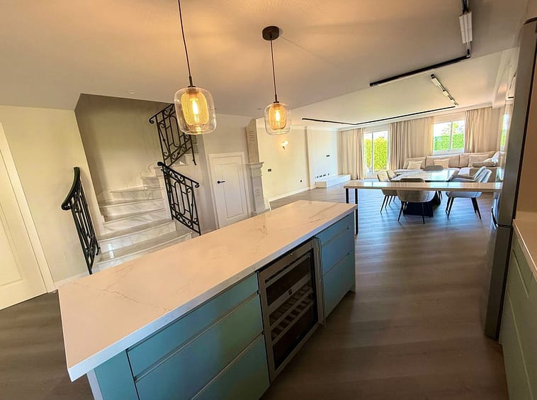 A spacious and bright living-dining room with fireplace, perfect for relaxing and sharing moments with family and friends