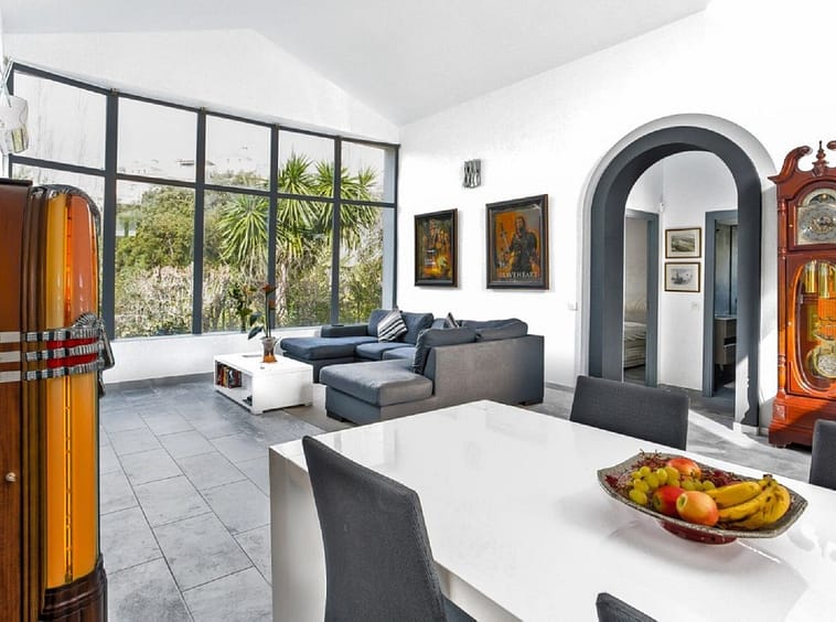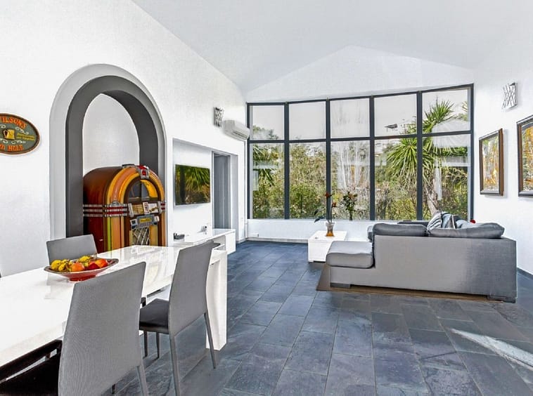 Refurbished to high standards, the villa features a bright living/dining area with a stunning cathedral ceiling