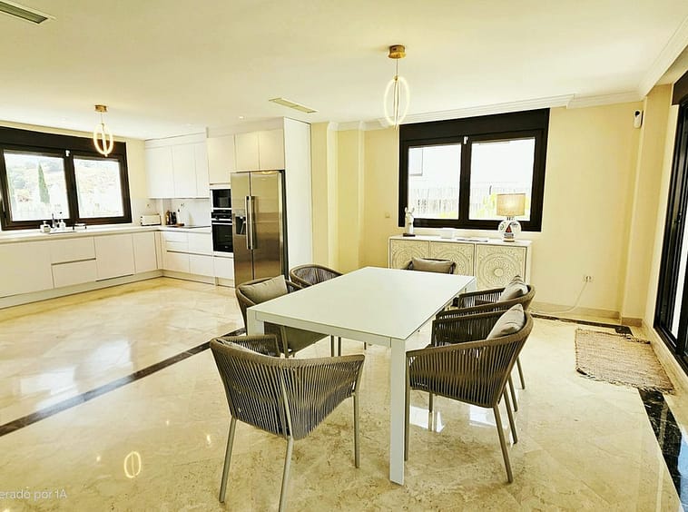 Welcome to this elegant and bright exclusive villa located in one of the quietest and most privileged areas of Estepona, in the heart of the Azata golf course. Upon entering the property, we are greeted by a large and welcoming entrance that leads directly to the spacious living and dining room with a fireplace, ideal for family gatherings or relaxing moments.