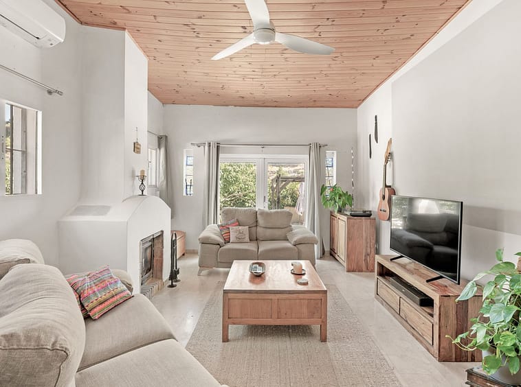 From the driveway we reach the front door which opens onto the cozy living room with fireplace and acces to the outdoor pool area.