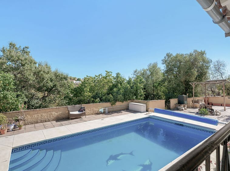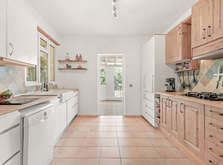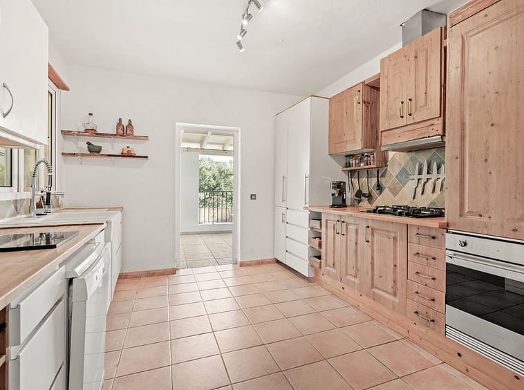 The kitchen is fully equipped and leads onto the wonderful and spacious covered terrace with views over the pool and the surrounding landscape, perfect for outdoor dining.
