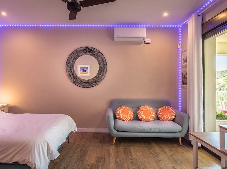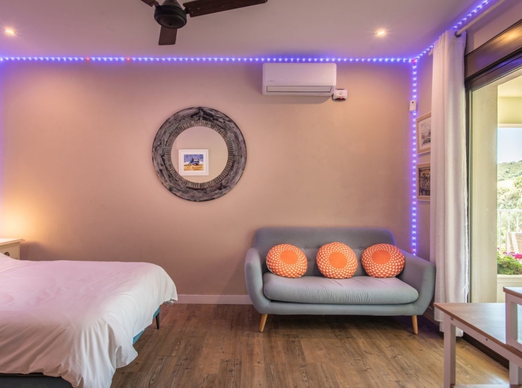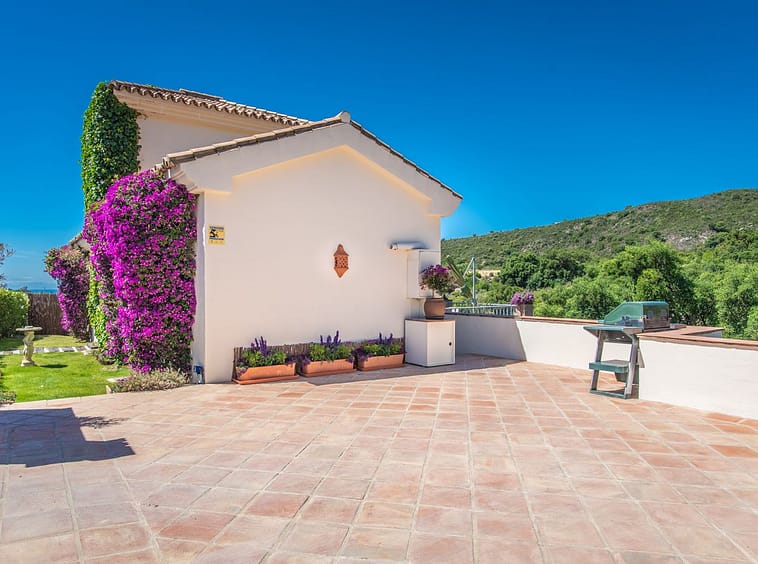 The villa is a contemporary Andalucían style, west-facing, and spans two levels. It features three double-bedroom suites set in the cool overlooking treetops, each with tasteful natural slate mosaic, wood, and glass bathrooms that complement the natural surroundings. The master bedroom suite is exceptionally spacious at 40m², larger than a typical two-bedroom flat in Central London. All bedrooms open onto large terraces, providing privacy and stunning views.