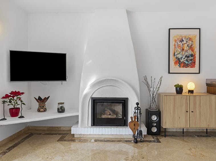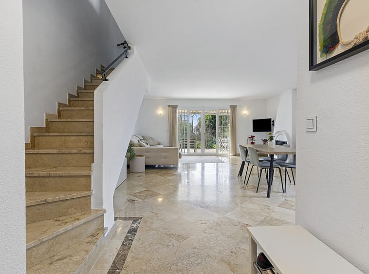 A marble staircase leads to the upper floor, where high vaulted ceilings enhance the sense of space. The master bedroom is well-proportioned and features an en-suite bathroom. An unusually wide hallway leads to two additional bedrooms and a family bathroom.