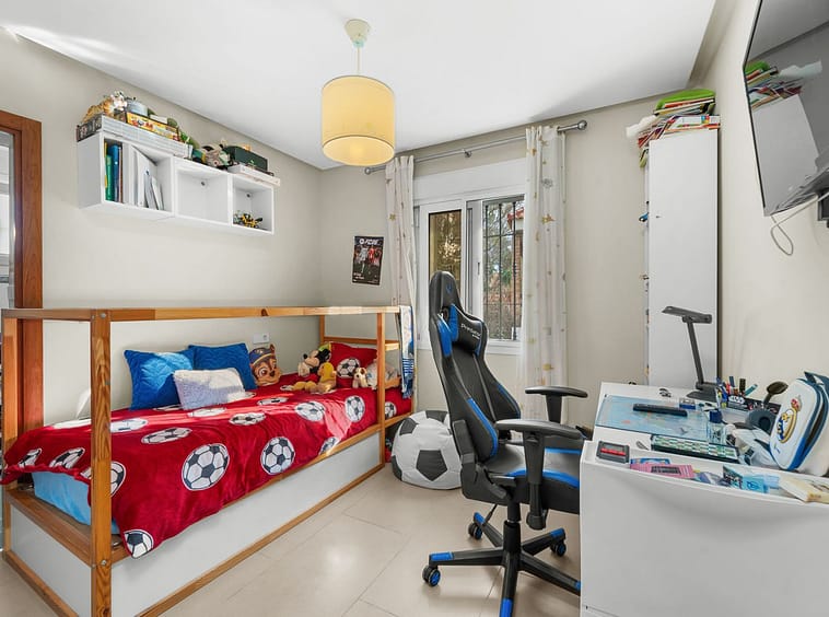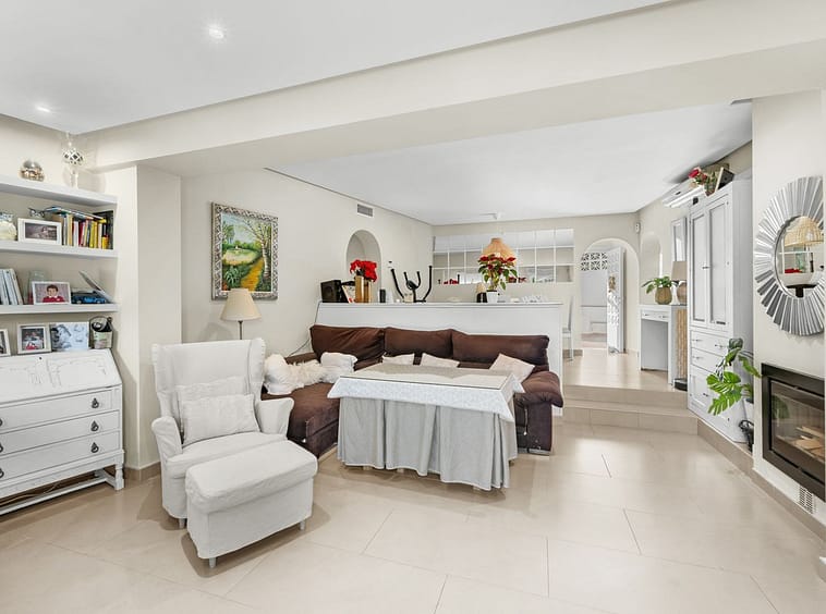 The heart of the home is its open-plan living and dining area, arranged on different levels, providing a modern and contemporary concept. The fireplace adds a warm and cozy atmosphere, ideal to enjoy at any time of the year. From here, you can access spacious terraces, some covered with awnings, perfectly prepared for year-round use, offering pleasant views of the garden and the communal swimming pool.