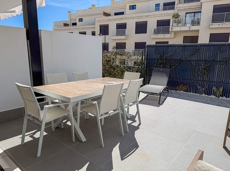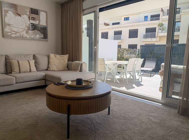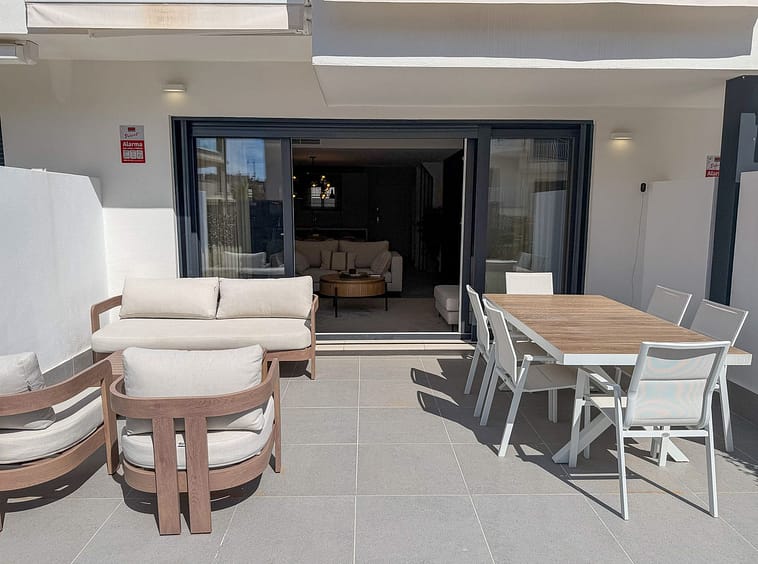 The main living area is bright and welcoming, opening onto a spacious west-facing terrace. Large glass doors allow natural light to fill the interior while creating a natural flow between the living room and the outdoor space. The terrace offers ample room for both lounge seating and outdoor dining, making it an ideal setting for relaxed evenings and entertaining.