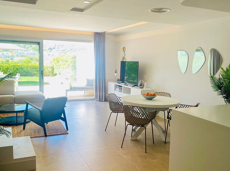 Built by a renowned British developer, the property is located in the exclusive, gated community of NATURA – a small and very private complex with only 40 residential units. The communal facilities are immaculately maintained and offer spacious garden areas, a large swimming pool and a separate children's pool. Nestled in the rolling hills of La Cala de Mijas and with direct access to the golf course landscape, you can enjoy absolute peace, security and Mediterranean flair here.