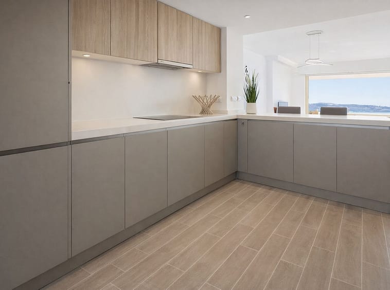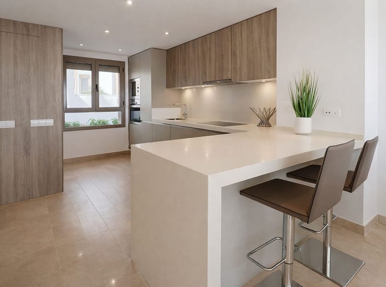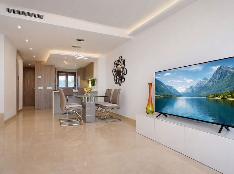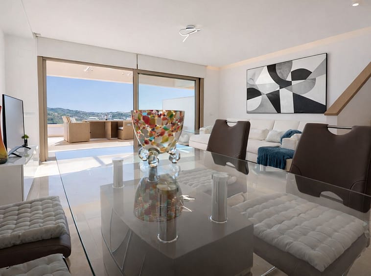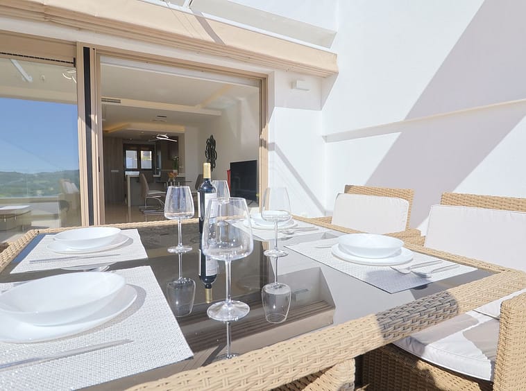 The main living area features a bright open-plan lounge and dining space with floor-to-ceiling sliding doors that open directly onto a private terrace, perfect for relaxing, entertaining or enjoying the Mediterranean climate all year round, with open views towards the golf course and surrounding mountains. A modern, fully equipped kitchen complements the living space, designed for both functionality and contemporary living.