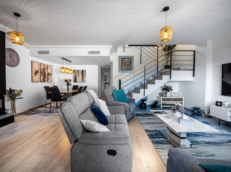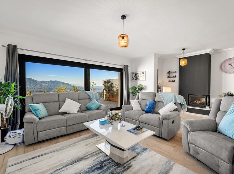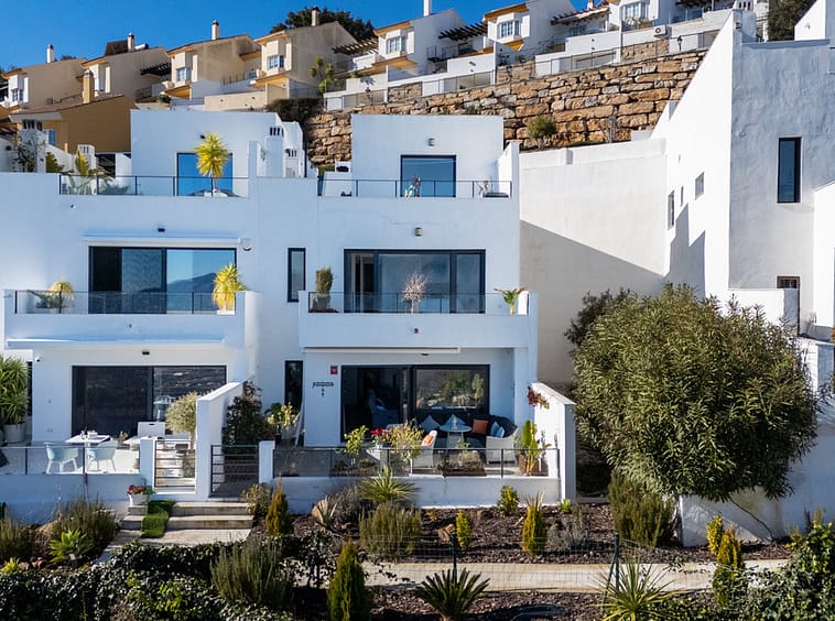 Casa Altavista is a south east facing luxury townhouse for sale with panoramic mountain sea and coastal views. It offers three bedrooms and three ensuite bathrooms within 172 m2 built. The modern spacious kitchen has a view and direct access to the internal patio. Open plan living and dining areas lead to the main terrace with a gate to a small private garden. The home includes air conditioning central heating a wood burning fireplace two private parking spaces and a storage room.