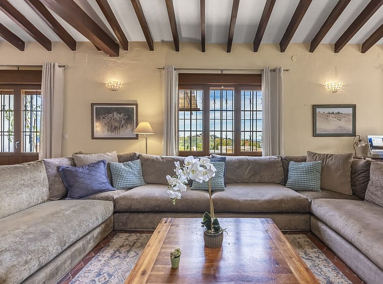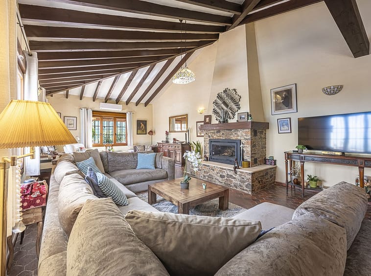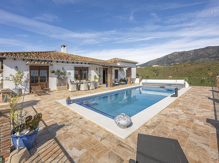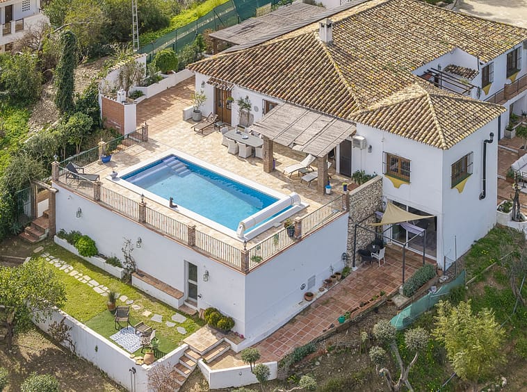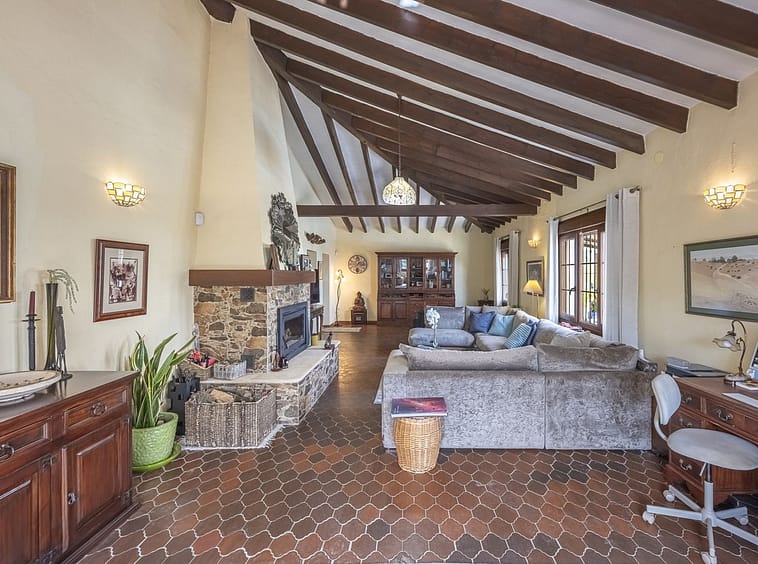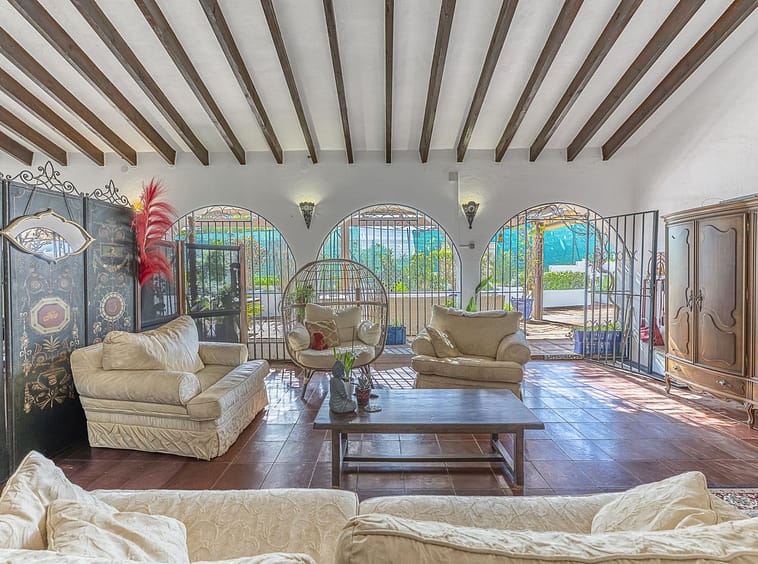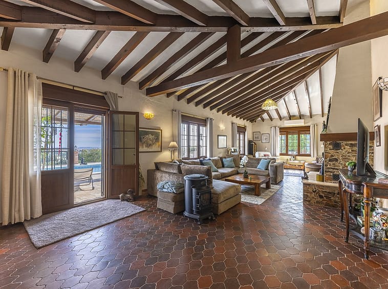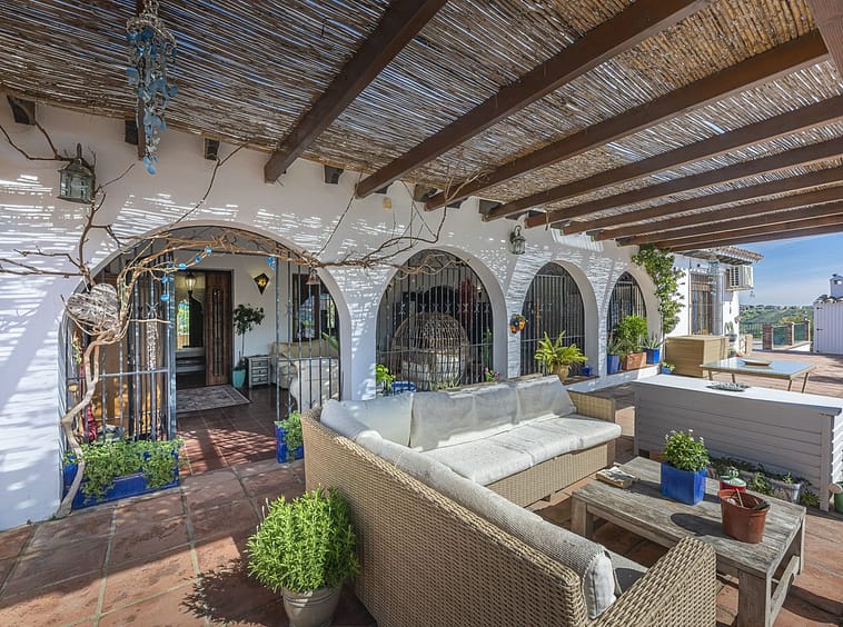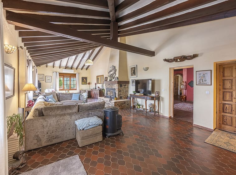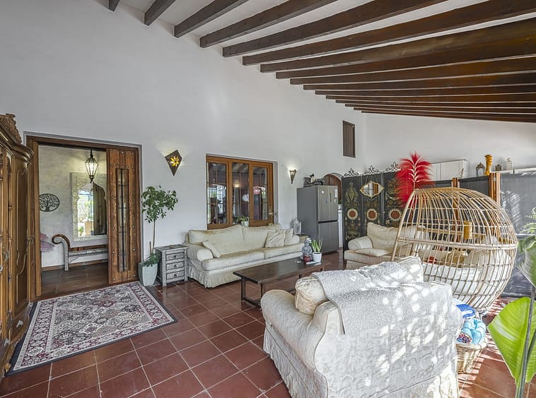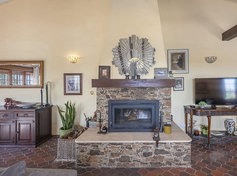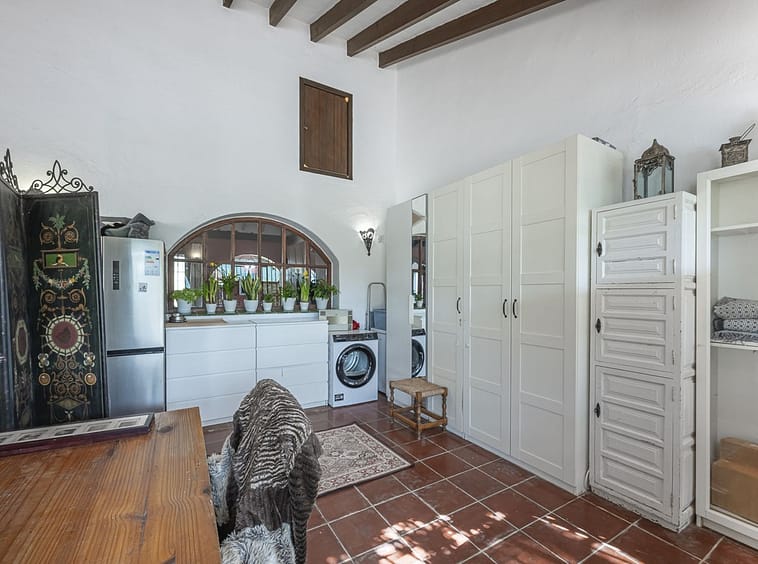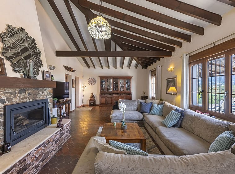 Outside, the various patios and terraces surround a private pool where the sun shines all day. The property also offers parking for more than four vehicles, several storage rooms, and its own well that supplies water to the gardens and fruit trees that adorn the estate. Among its modern amenities are solar panels with battery storage, providing energy efficiency and sustainability.