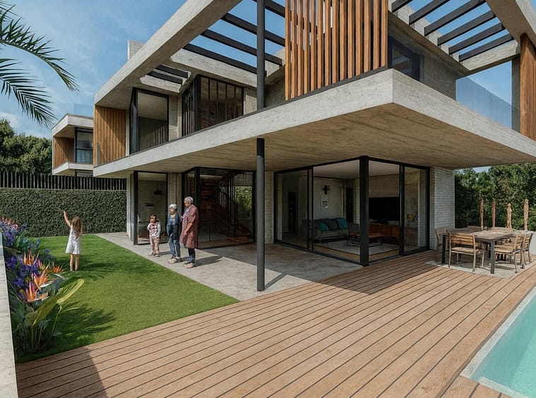 The exterior is designed for relaxation and entertainment, boasting a private swimming pool, sunbathing areas, and a fully equipped BBQ zone perfect for gatherings.