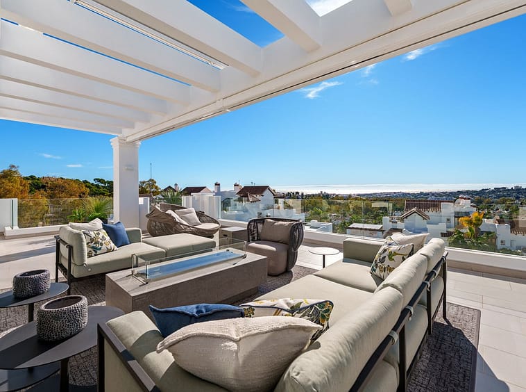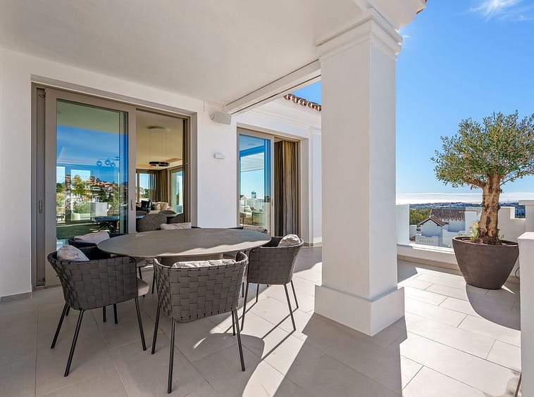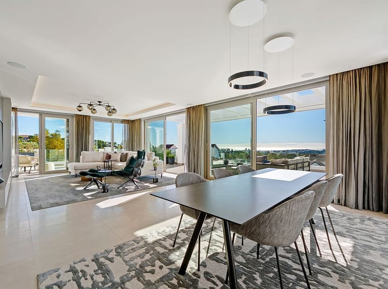 This exceptional duplex penthouse is located within an exclusive gated community in Aloha, one of the most prestigious residential developments in Nueva Andalucía. Set in an elevated position, the property enjoys panoramic open views across the surrounding greenery, mountains, and toward the Mediterranean. The community is renowned for its contemporary architecture, privacy, and resort-style facilities, including landscaped gardens, multiple swimming pools, spa, gym, and 24-hour security.