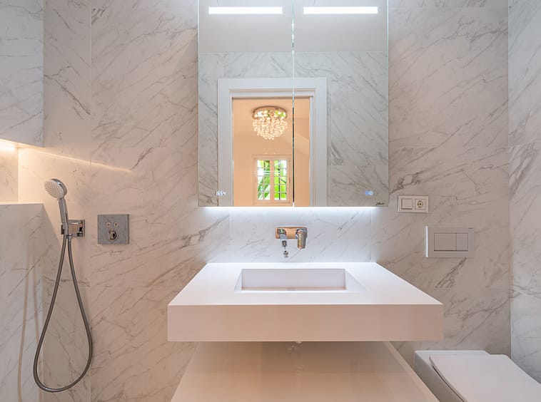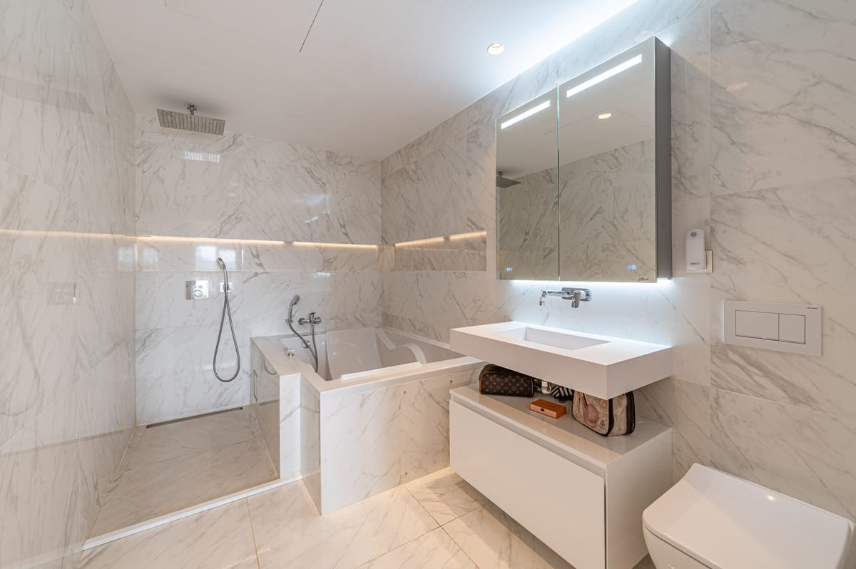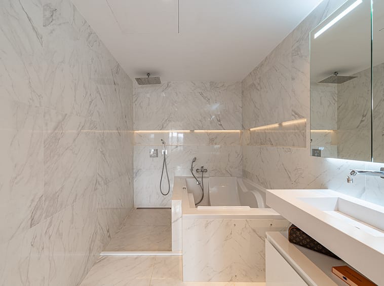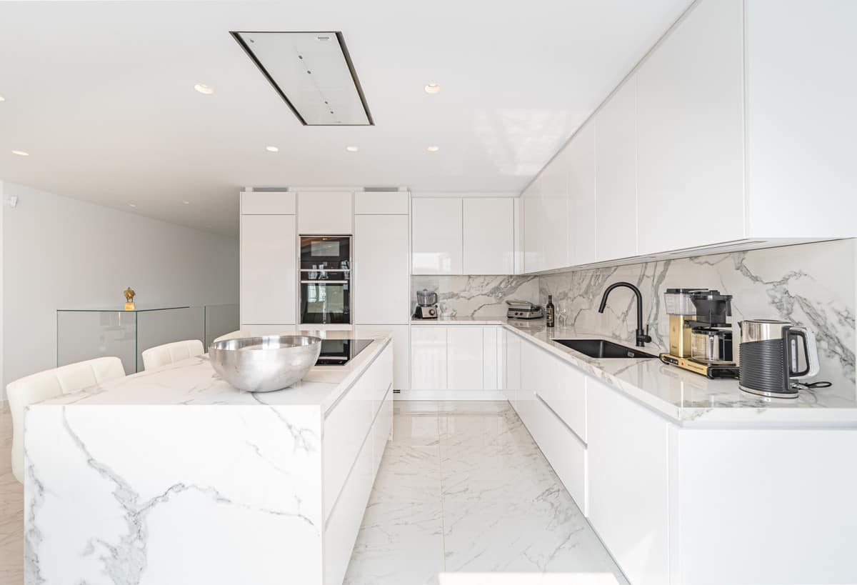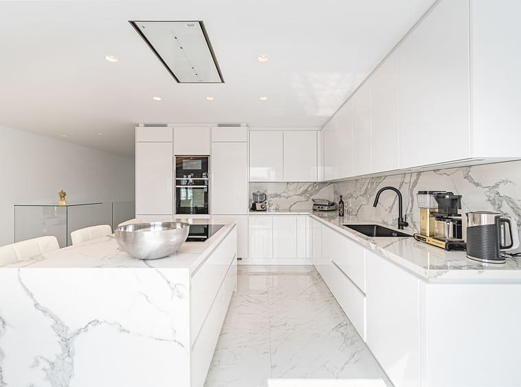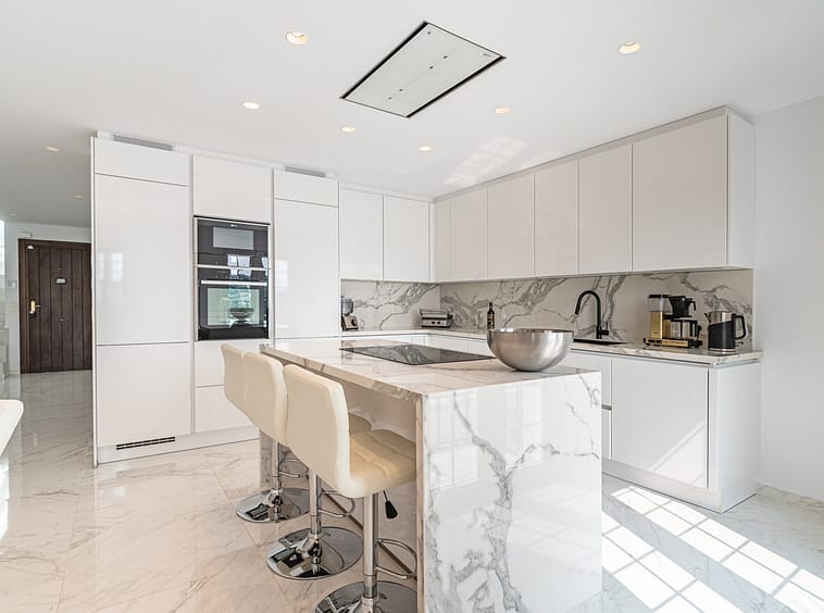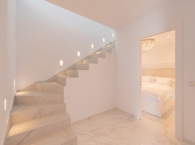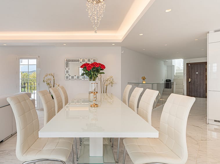 Spanning 158m² over three floors, the townhouse blends modern design with abundant natural light. The entrance level features an elegant, open-plan kitchen with a glossy breakfast island (seating for three) and floor-to-ceiling windows that flood the space with sunshine. Adjacent to the kitchen, the sun-filled living/dining area flows seamlessly outdoors, with sliding doors amplifying the bright, airy feel. A guest bedroom with an en-suite bathroom, also on this level, benefits from the same warm, natural light. The primary and second bedrooms downstairs include en-suite bathrooms designed with clean lines and contemporary finishes. The crowning feature is the 100m² roof terrace with uninterrupted sunset views over the Golf Valley. Designed for indoor-outdoor living, the terrace’s minimalist layout and sun-drenched surfaces make it ideal for relaxing or entertaining. Every level prioritises light and modern simplicity, creating a bright, inviting home.