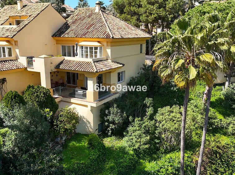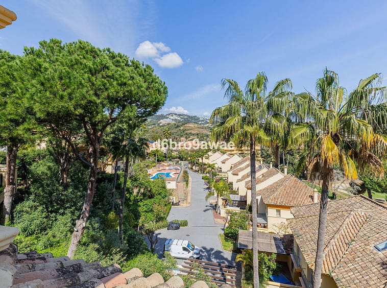 Classic Andalusian semi-detached corner townhouse in Río Real, Marbella East, featuring 3 bedrooms, 2 bathrooms, excellent privacy, multiple terraces, and a secure parking space in carport on private grounds. Quietly located, close to the beach and Marbella town centre, with views over the golf course and subtle sea views.