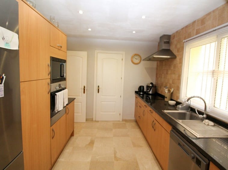 The expansive lounge and dining area with feature fireplace lead onto a large twin-arch terrace, complete with fitted toldos, an extractor for the BBQ, and spectacular views of the golf course, lake, and sea. A small lawned garden provides an additional outdoor space to relax and enjoy the surroundings.