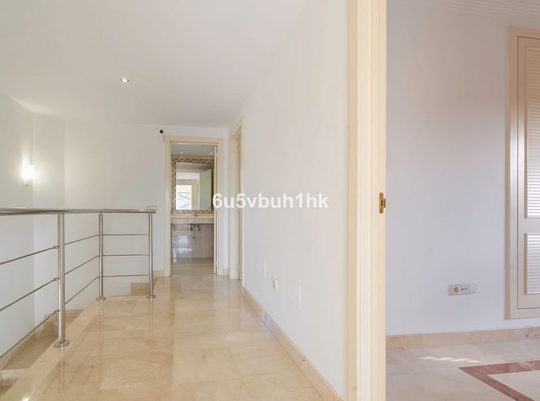 The upper floor houses three double bedrooms and two full bathrooms. The master bedroom has an en-suite bathroom with a shower and bathtub, as well as access to two private terraces with unobstructed views of Riviera del Sol, providing natural light and a pleasant sense of spaciousness.