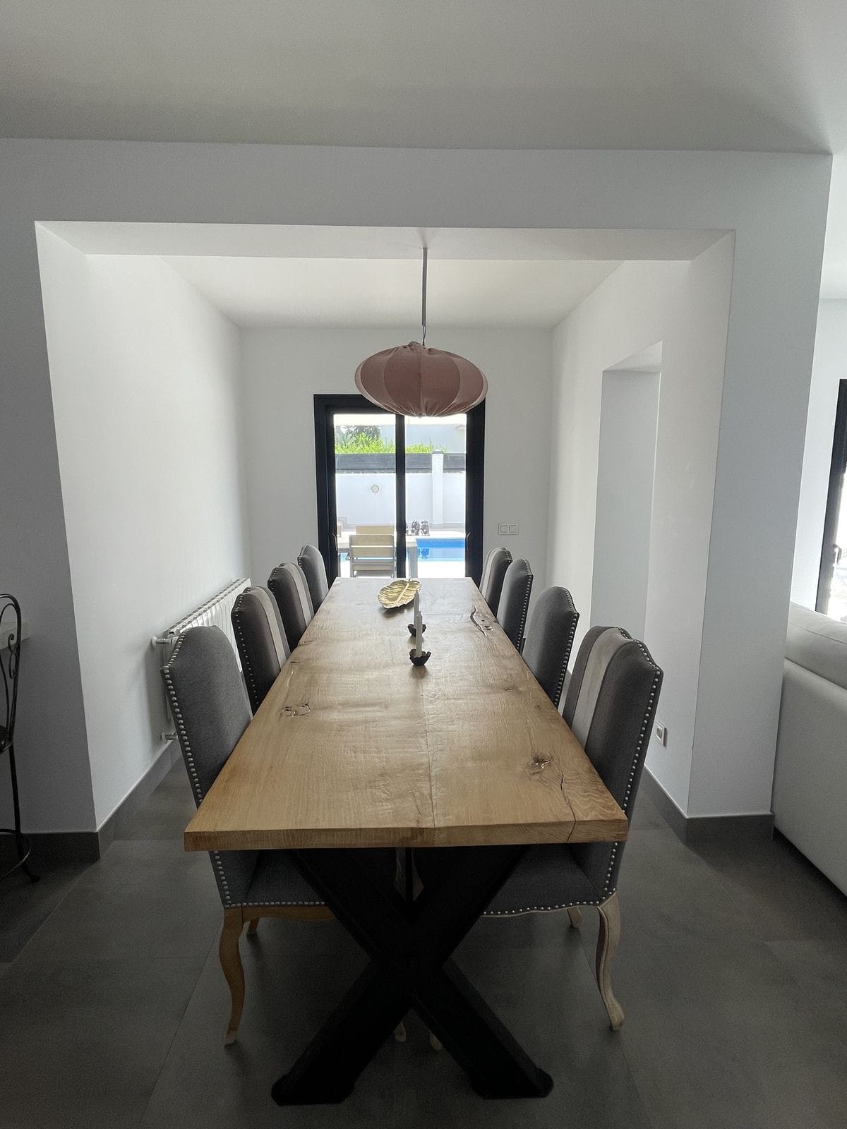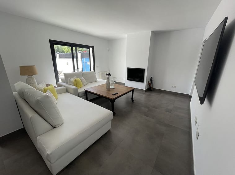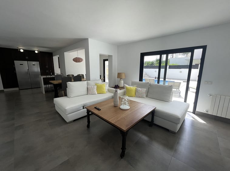 The exterior is simply stunning: a large pool with a shower and sun loungers invites you to relax in the sun. You'll also find a separate covered parking area for two cars, ensuring comfort and security for your vehicle.