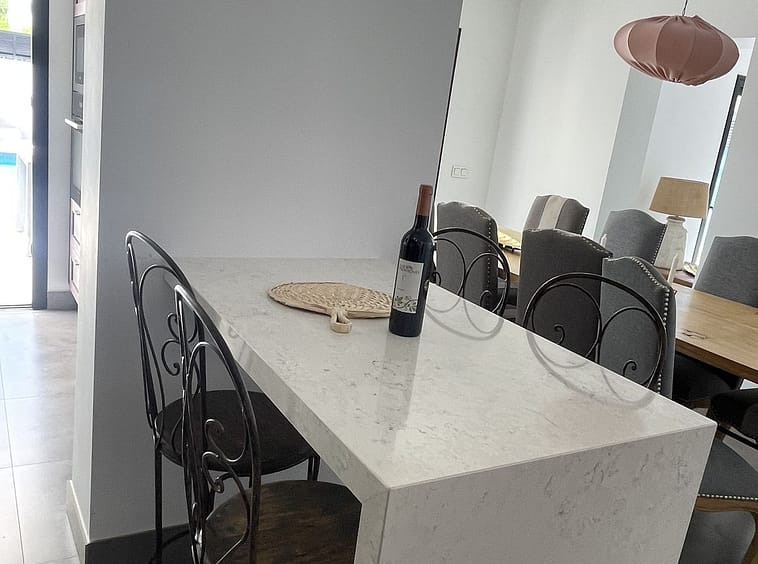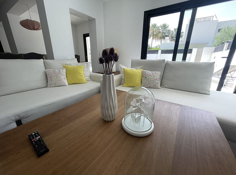 The villa has three bedrooms, each with an en-suite bathroom, arranged around a charming interior patio that provides a touch of serenity and privacy. It also has a laundry area and built-in wardrobes that add functionality to the space.