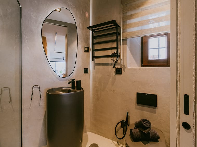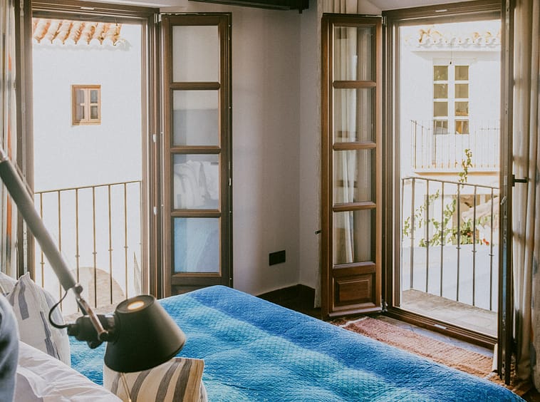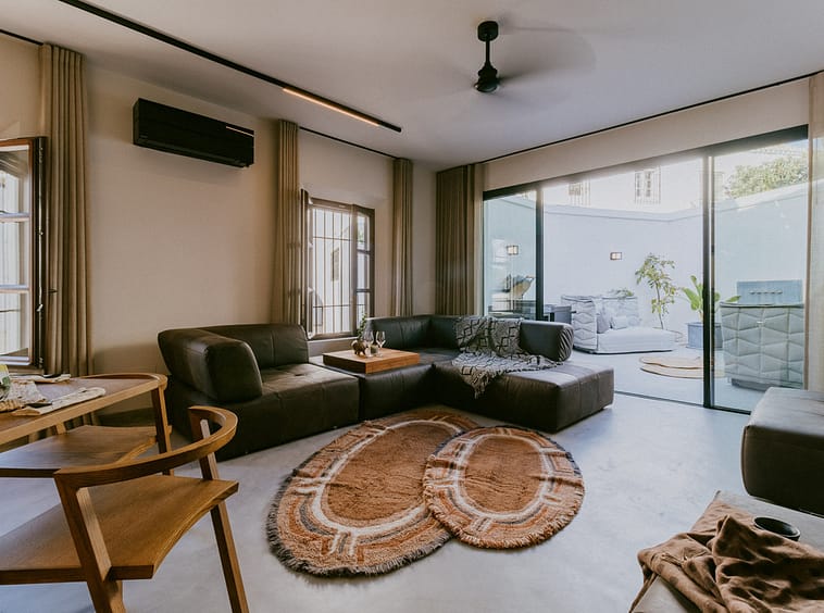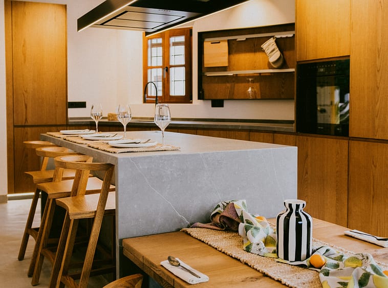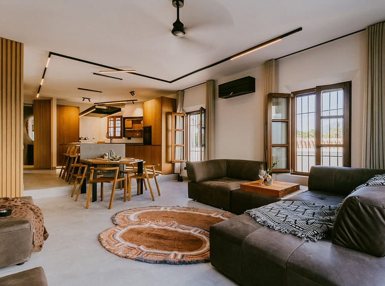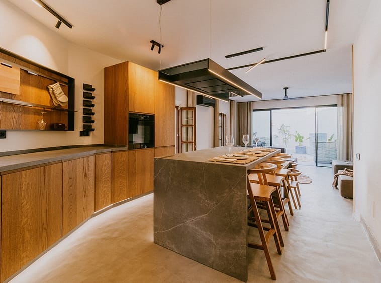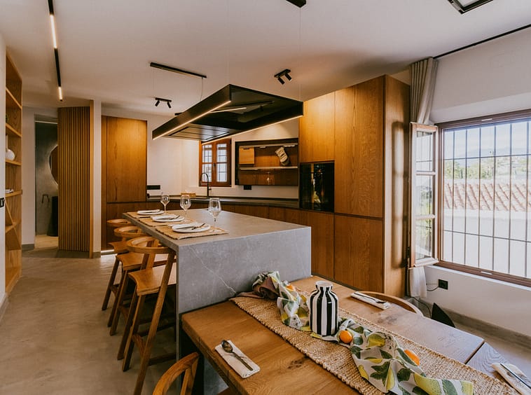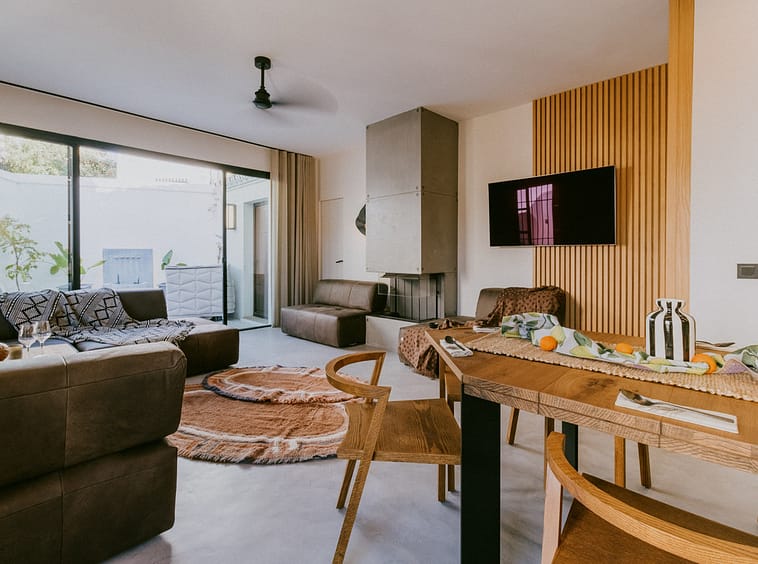 The open-plan living and dining area is bathed in natural light, providing a luxurious yet comfortable space with a real wood fireplace, perfect for relaxing or entertaining. Expansive glass doors lead to a private Andalusian-style patio, offering a serene retreat for outdoor relaxation.