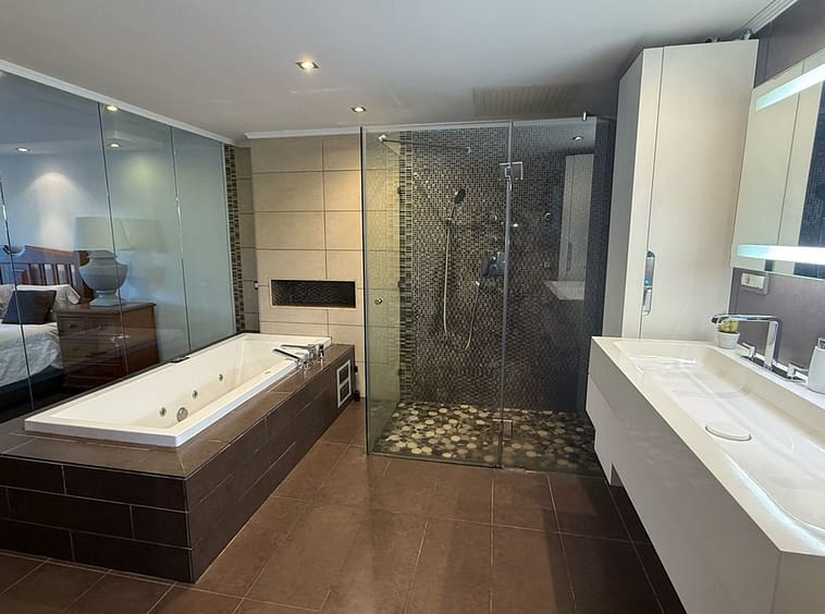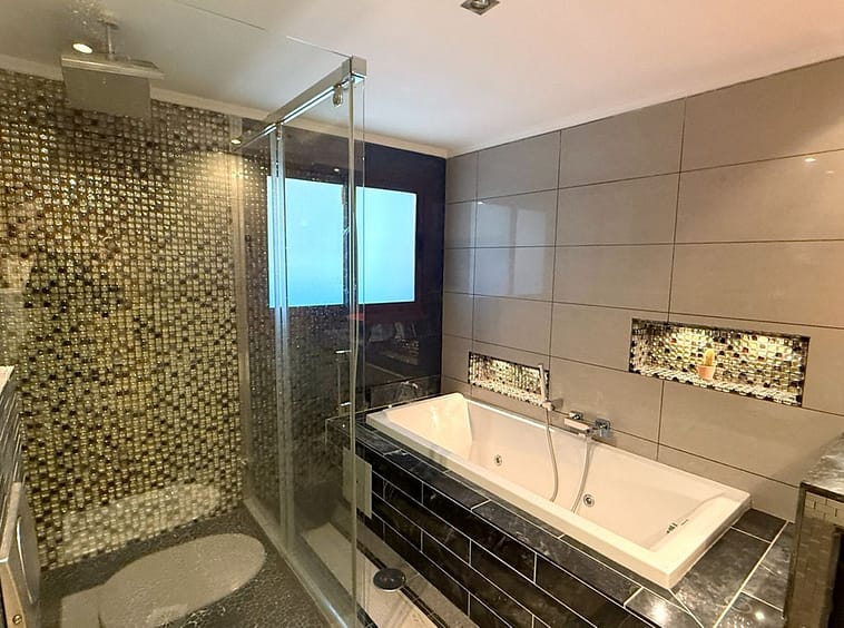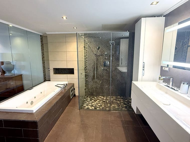 Ascend to the upper level, where you’ll find a sophisticated third bedroom with an en-suite bathroom, offering a peaceful and private space. This floor also provides access to a spectacular rooftop solarium, where you can soak in stunning panoramic views and enjoy additional outdoor space for relaxation, sunbathing, or entertaining under the open sky.