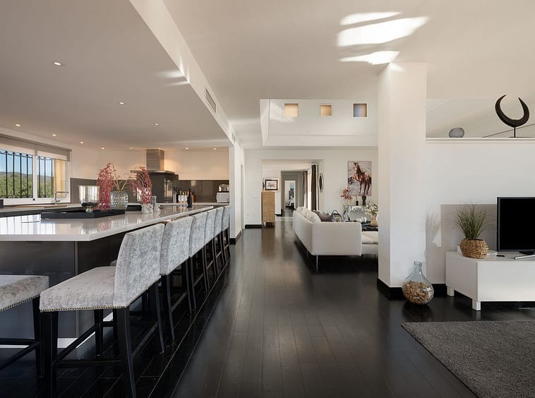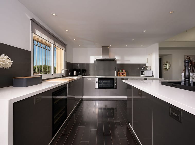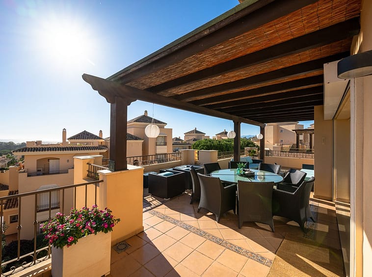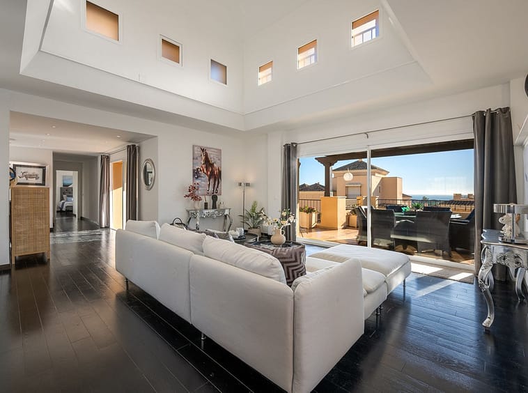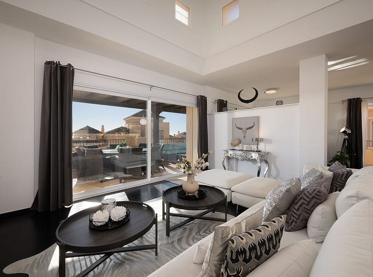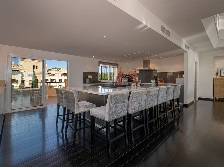 Entering the penthouse from the garage or entrance level, the private lift opens into a hall that leads to a bright living room with high ceilings, creating an atmosphere of spaciousness and elegance. This level also features a dining room, a modern open kitchen equipped with high-end appliances, and a large terrace that covers 360º of the apartment. The property has over 200 m2 of terraces, and is ideally located, overlooking the pools with easy and direct access.