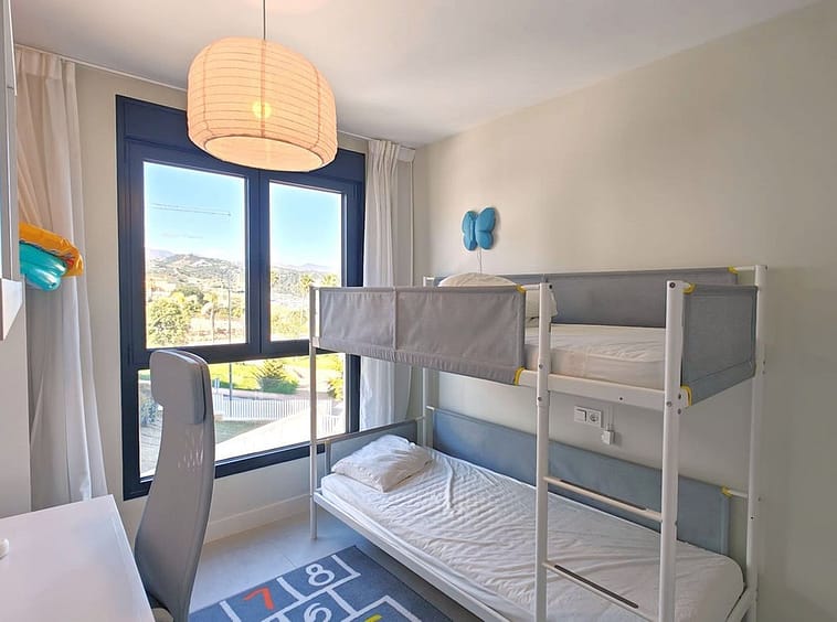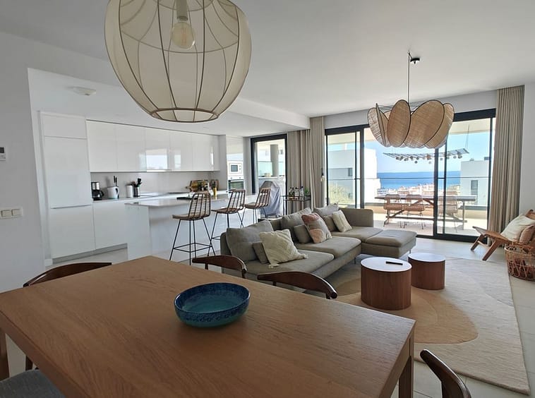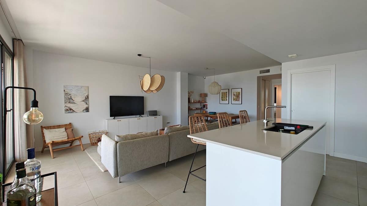 This rare four-bedroom home spans 112 m² of living space plus a generous 43 m² terrace with south, southeast and west orientation, ensuring sun and shade throughout the day. The west-facing section overlooks the communal pool area, while the rest enjoys breathtaking sea views. The open-plan kitchen flows seamlessly into the bright living-dining room, with direct terrace access from the kitchen, lounge and two bedrooms. The other two bedrooms enjoy mountain views and abundant natural light through large windows.
