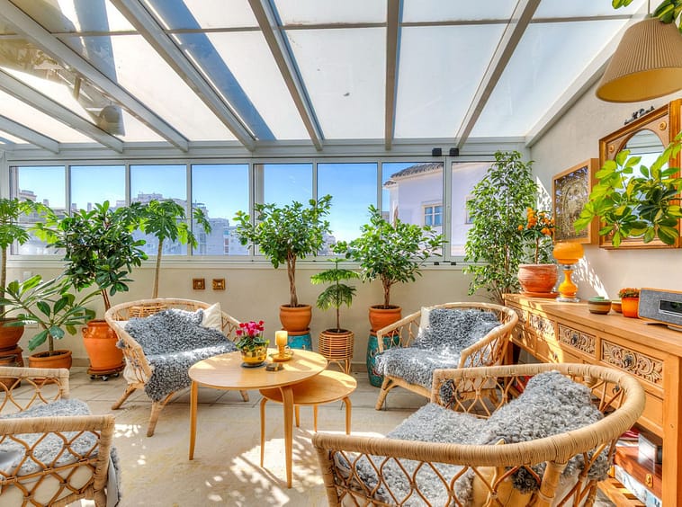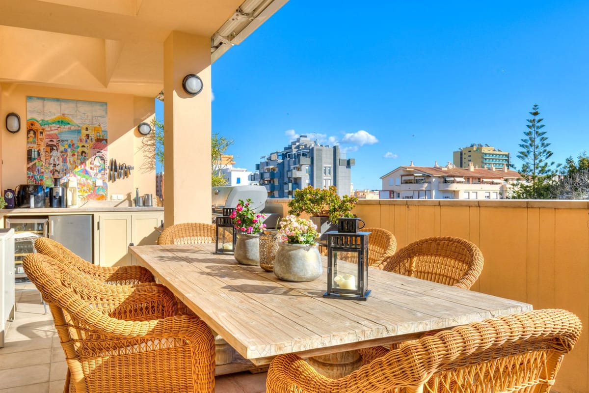 Welcome to this unique and bright single-level penthouse with a total built area of 174 m², ideally located in the very heart of Fuengirola. Here you enjoy an unbeatable location within walking distance of the marina, shops, restaurants and all amenities. The train and bus stations are just a few metres away, and the beautiful sandy beach can be reached in approximately 400 metres. The property offers a well-thought-out layout and a wonderful sense of space and light throughout. You are welcomed by a generous entrance hall, with the master bedroom located to the left, featuring a large en-suite bathroom with walk-in shower. Further into the apartment, there is a guest toilet and an impressive living area with an open-plan layout connecting seamlessly to an exclusive Danish-designed kitchen of the highest quality. A spacious dining area makes this space ideal for social gatherings. In a separate section of the living area, you will find a charming lounge room that was previously part of the terrace and is now fully enclosed with glass. This room extends the living season and creates a natural transition between indoor and outdoor spaces. From here, double doors also lead out to the terrace.
