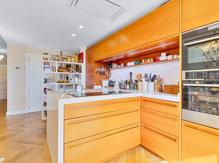 From a separate hallway off the living room, you access the home’s additional three bedrooms, a large family bathroom, a laundry room and spacious storage areas. The entire apartment features beautiful wooden flooring with underfloor heating throughout and the well-maintained community also offers a large communal swimming pool, and the property also includes a private garage space in the underground parking.
