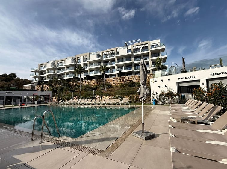 The complex offers extensive communal areas, including a heated outdoor pool, gym, SPA area, sauna, and a charming rooftop restaurant, perfect for relaxation.