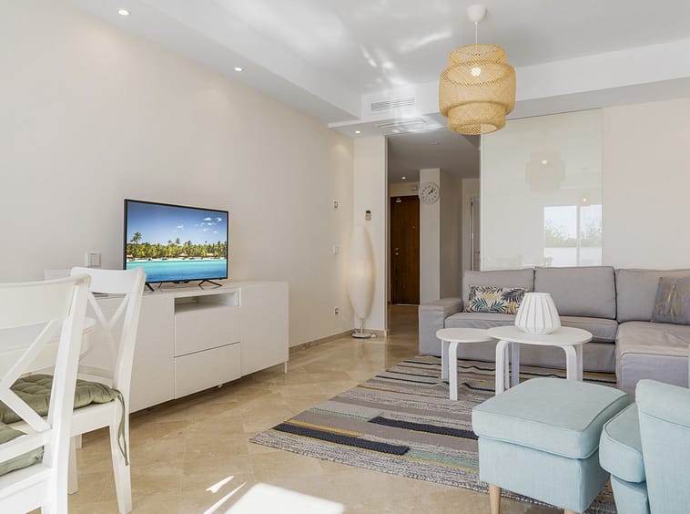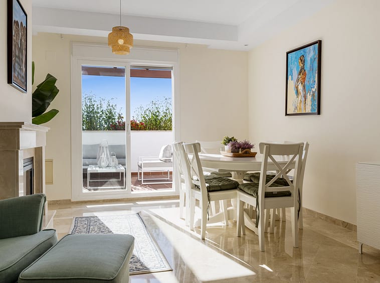 The apartment offers a bright and spacious open plan living and dining area that opens directly onto a private terrace, ideal for enjoying the sun throughout the day. The interior is tastefully designed in soft Mediterranean tones with modern furnishings, a cozy fireplace, and high quality finishes that create a warm and inviting atmosphere.