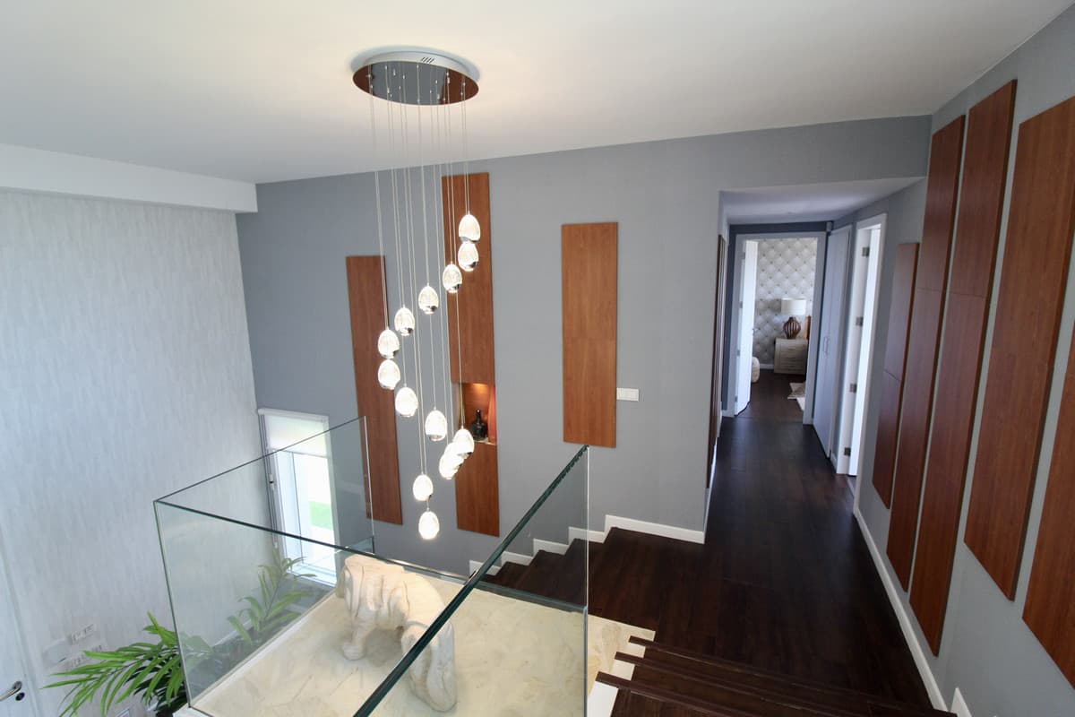The residence features 4 bedrooms, 3 of which have en-suite bathrooms, as well as an additional guest toilet, guaranteeing comfort and privacy for its residents. The common areas include a spacious living room with a fireplace, a separate dining room, and a modern open-plan kitchen that is fully equipped. The interior boasts high-end finishes such as marble floors, fitted wardrobes, and a walk-in closet, along with convenient amenities like air conditioning, heating, and electric blinds.
