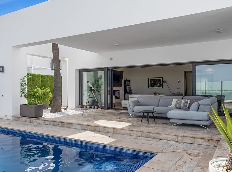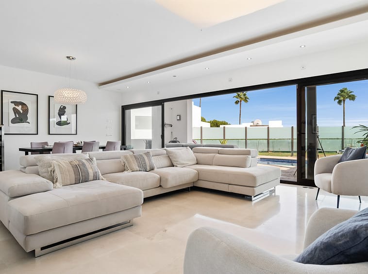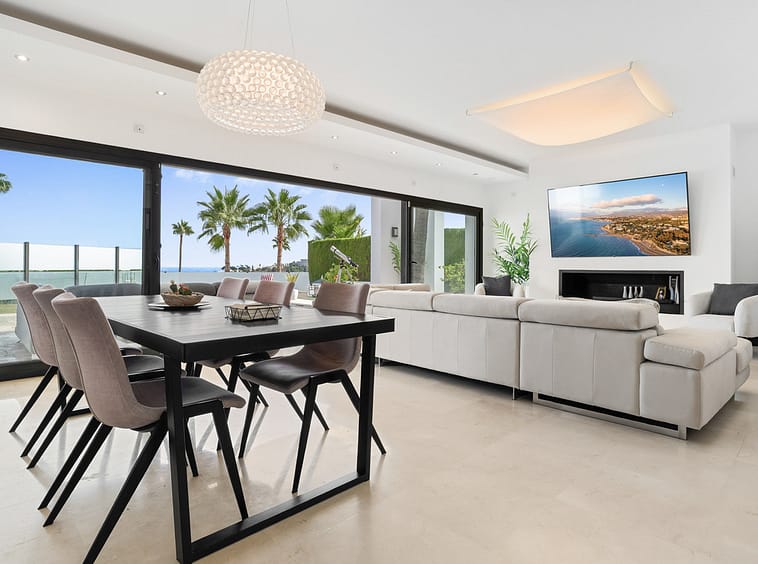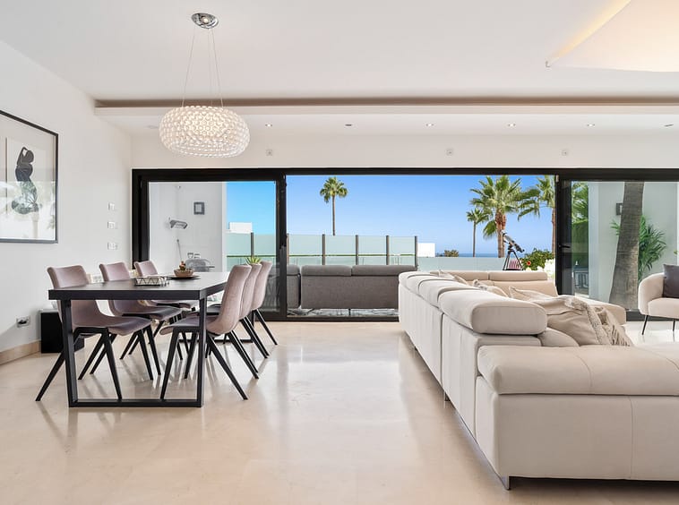 The interior comes fully furnished, showcasing a sleek, fully fitted kitchen, a bright dining room, and an inviting living area. Floor-to-ceiling glass doors flood the home with natural light while framing panoramic vistas of the sea, mountains, golf course, and surrounding greenery. Enjoy unobstructed views stretching across the coastline, a spectacular setting for entertaining or sunset cocktails.