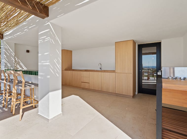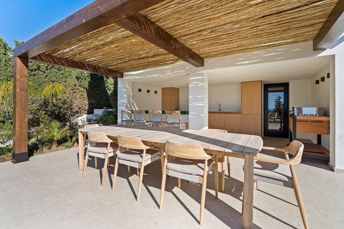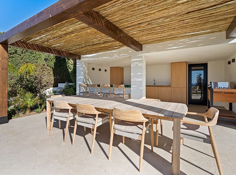 A fully equipped covered outdoor kitchen and bar area forms the heart of the terrace. It includes built-in fridges, a sink, worktop and seating, making it perfect for entertaining. Adjacent to this area is an impressive wooden dining table for 10 guests under a spacious pergola. All overlooking the sea.