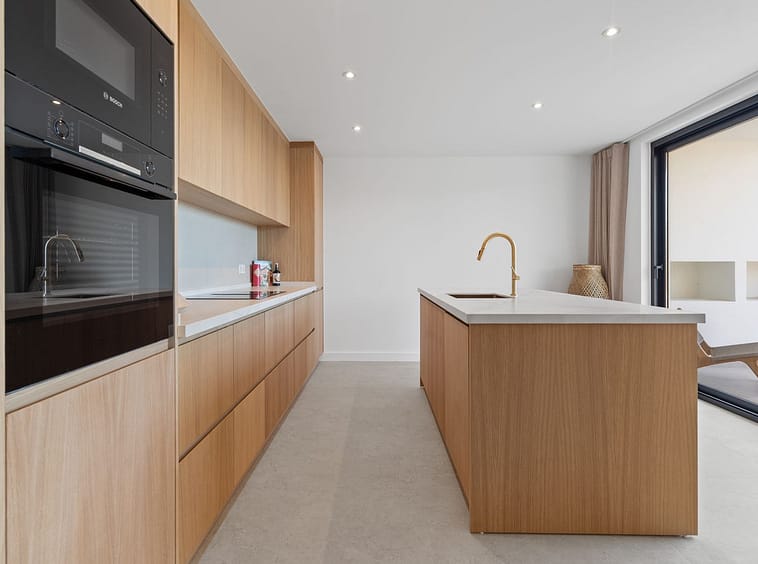 The open-plan living and dining area connects seamlessly to a bespoke oak kitchen equipped with high-end Bosch appliances. Large sliding windows create a smooth transition to the outdoor terraces and private swimming pool, allowing for true indoor-outdoor living.