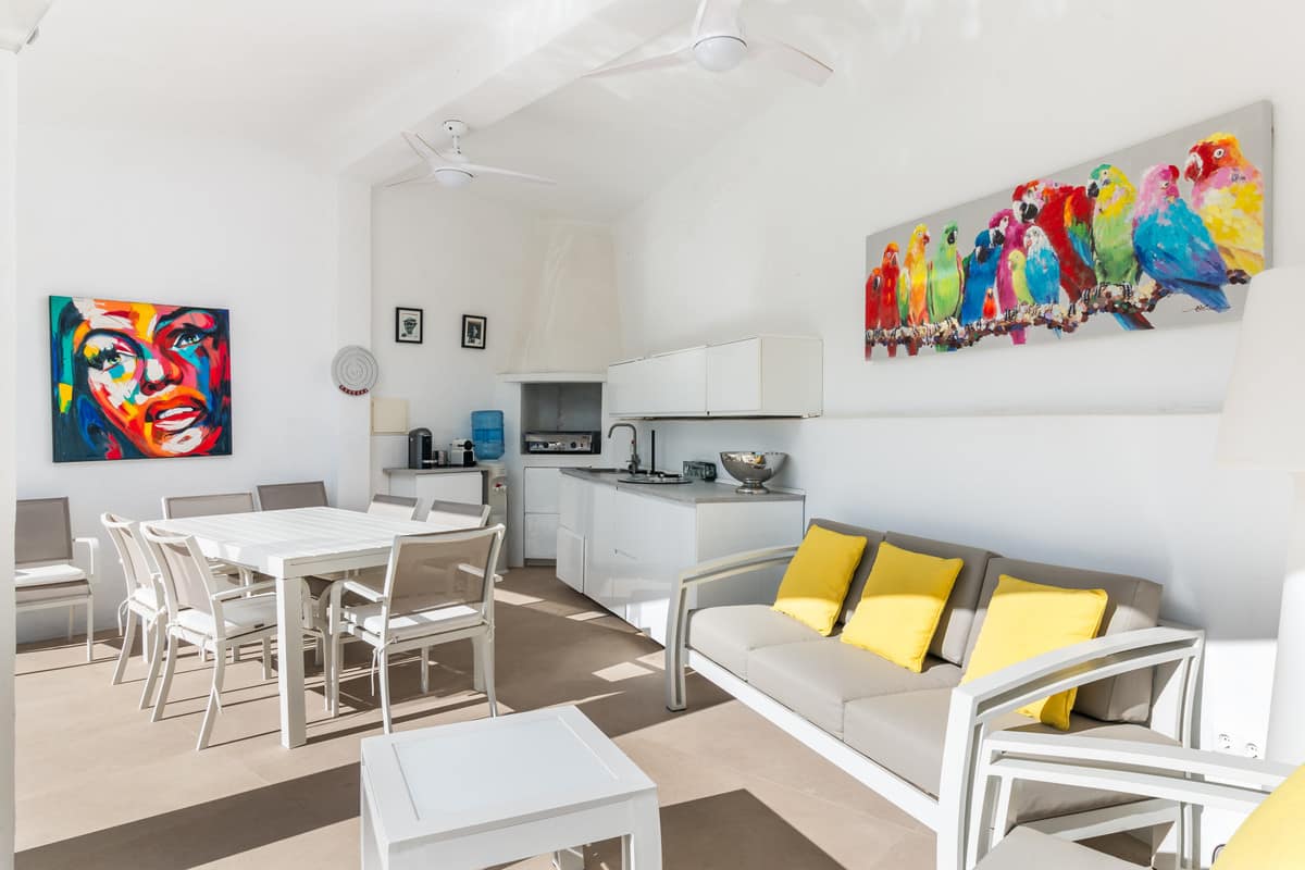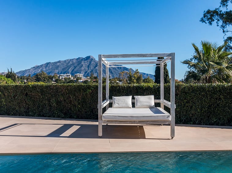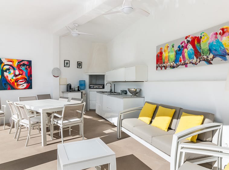 The villa’s outdoor spaces are equally impressive, designed for the ultimate Mediterranean lifestyle. A private swimming pool takes centre stage, surrounded by a beautifully maintained garden with panoramic views of the mountains and countryside. Adjacent to the pool, a poolside house features an outdoor kitchen and living area, ideal for al fresco dining and entertaining. The expansive private terrace provides further opportunities for outdoor relaxation, while the automatic irrigation system ensures the garden remains lush and vibrant year-round.