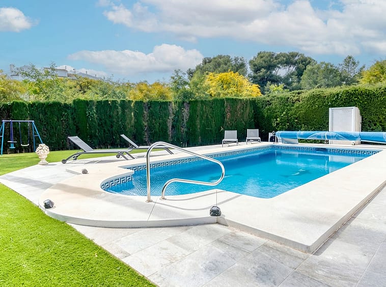 Outside, mature landscaped gardens surround the villa, creating privacy and a peaceful setting. The swimming pool sits beside generous terraces and a covered seating area, ideal for outdoor dining and entertaining.
