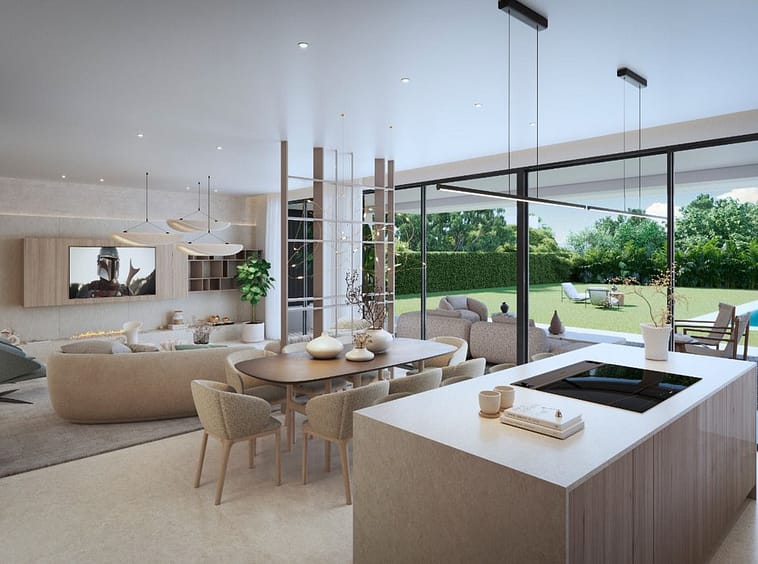 A wide, bright and highly functional social space enhanced by large panoramic windows with direct access to the garden and swimming pool.