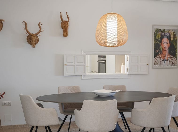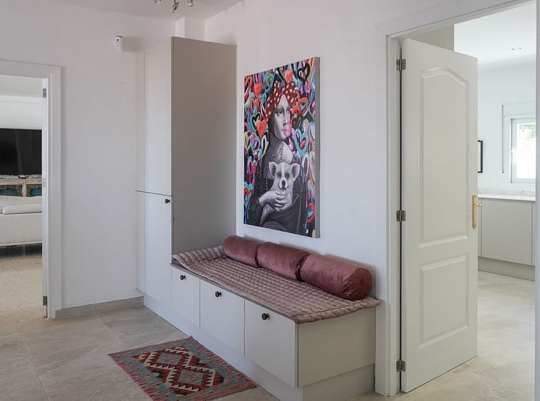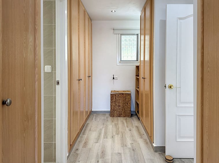 The spacious and bright living room opens onto a large terrace of 150m2 at the front of the house, where you will find a 40 m² swimming pool surrounded by plenty of space for sunbathing. From the living room there is also access to a large covered terrace of 65 m², ideal for outdoor dining, relaxing in the shade, or enjoying the mild Mediterranean climate throughout the year.